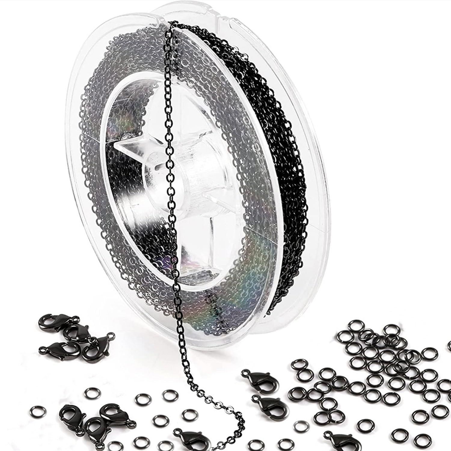 チェーン アクセサリー用チェーン 長さ約5メートル 幅1.5mm ジュエリーチェーン 小豆タイプ リングチェーン ジュエリー用 クラフト手作り用品 DIY用 ハンドメイド アクセサリーパーツ 基礎パーツ ロブスター・クラスプ10個とジャンプ・リング30個付き (黒色)