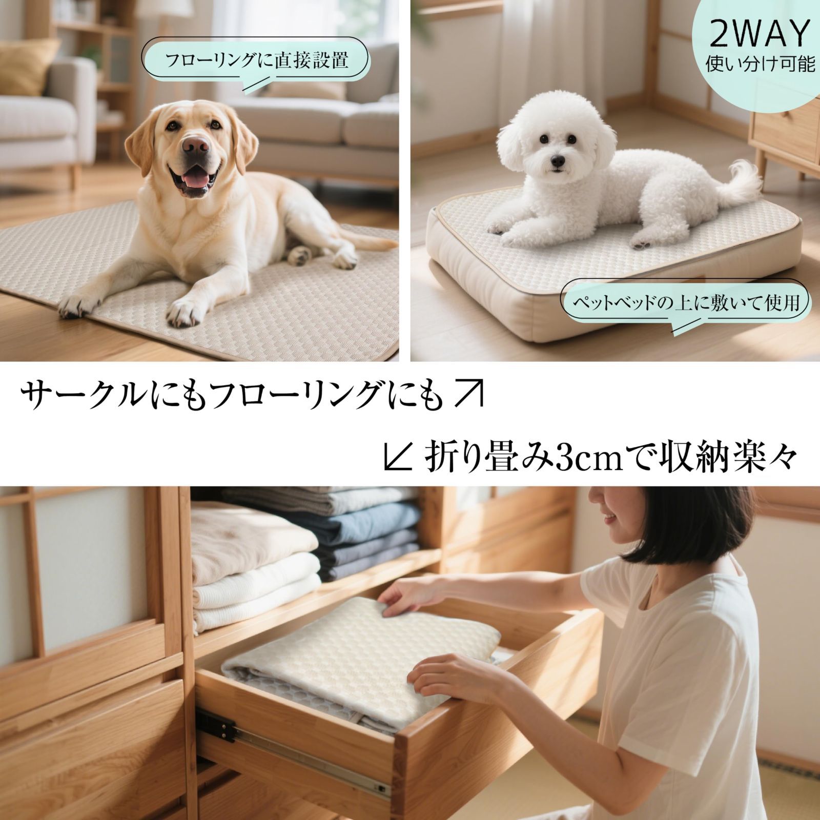 ? 【多機能使用シーン】 室内用ペットベッドはもちろん、車移動時のシートカバー・キャンプ用マット・ケージ内敷きとしても活用可能。折り畳み可能で収納時厚さ3cm(クローゼット隙間収納可)。シンプルなライトグレー&ベージュは、猫の毛色とも調和し、どんなお部屋のインテリアにも自然にマッチ。多頭飼い家庭でも統一感のあるデザインです。