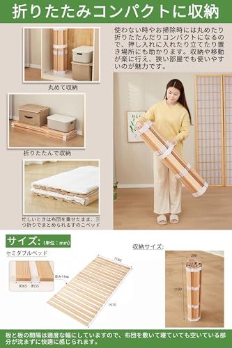 【収納簡単・軽量】使わない時に丸めてクロゼットや押入れに収納できるロールタイプです。また、忙しいときは布団を乗せたまま、三つ折りでまとめられるすのこベッドです。来客の時や帰省した家族が簡易ベッドとして使えます。コンパクトタイプなので、折り畳みや持ち運びは楽に行えます。