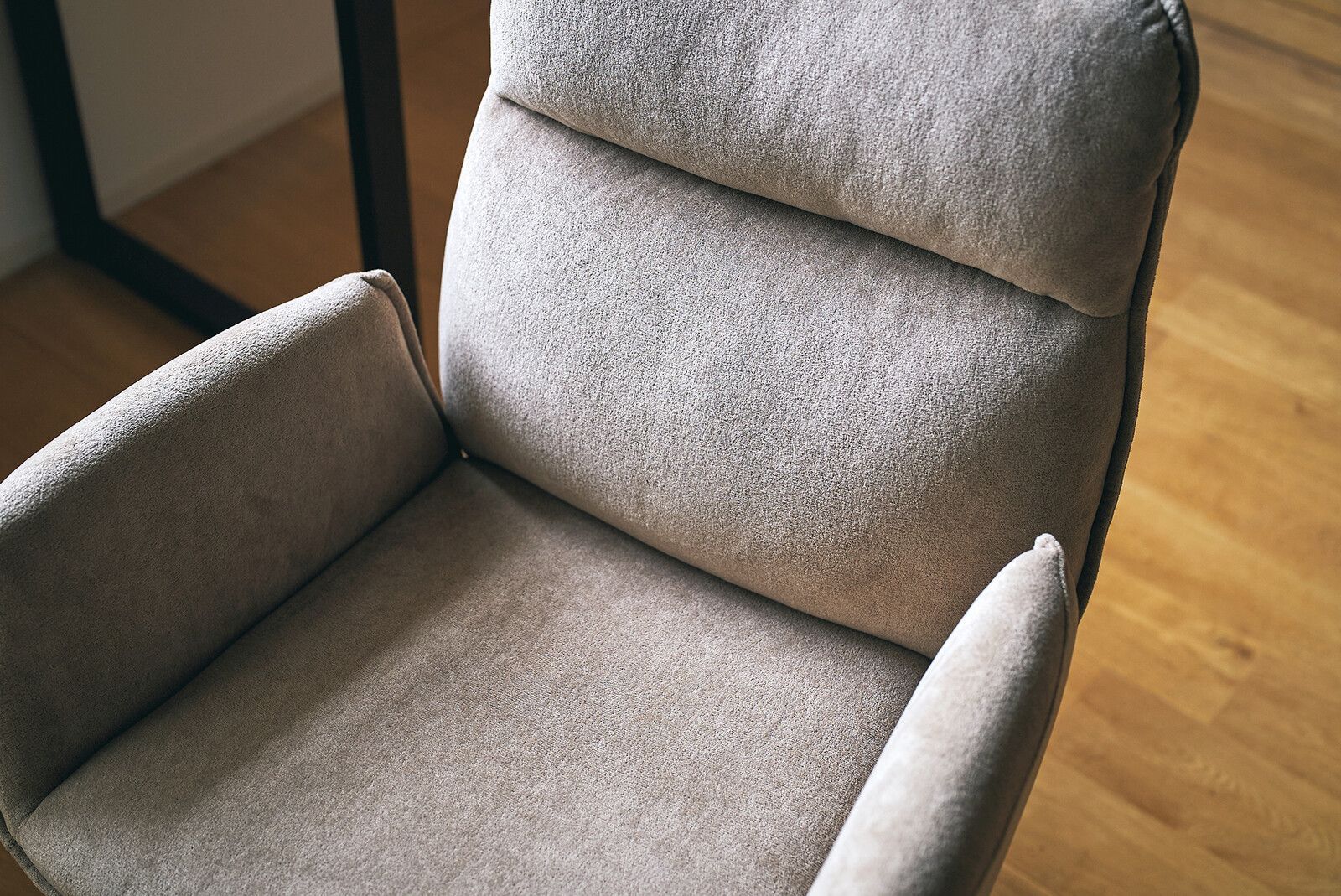 コンパクトなひじ掛けは、作業スペースを圧迫しないサイズ感でありながら、体をしっかり支える安定性を確保。