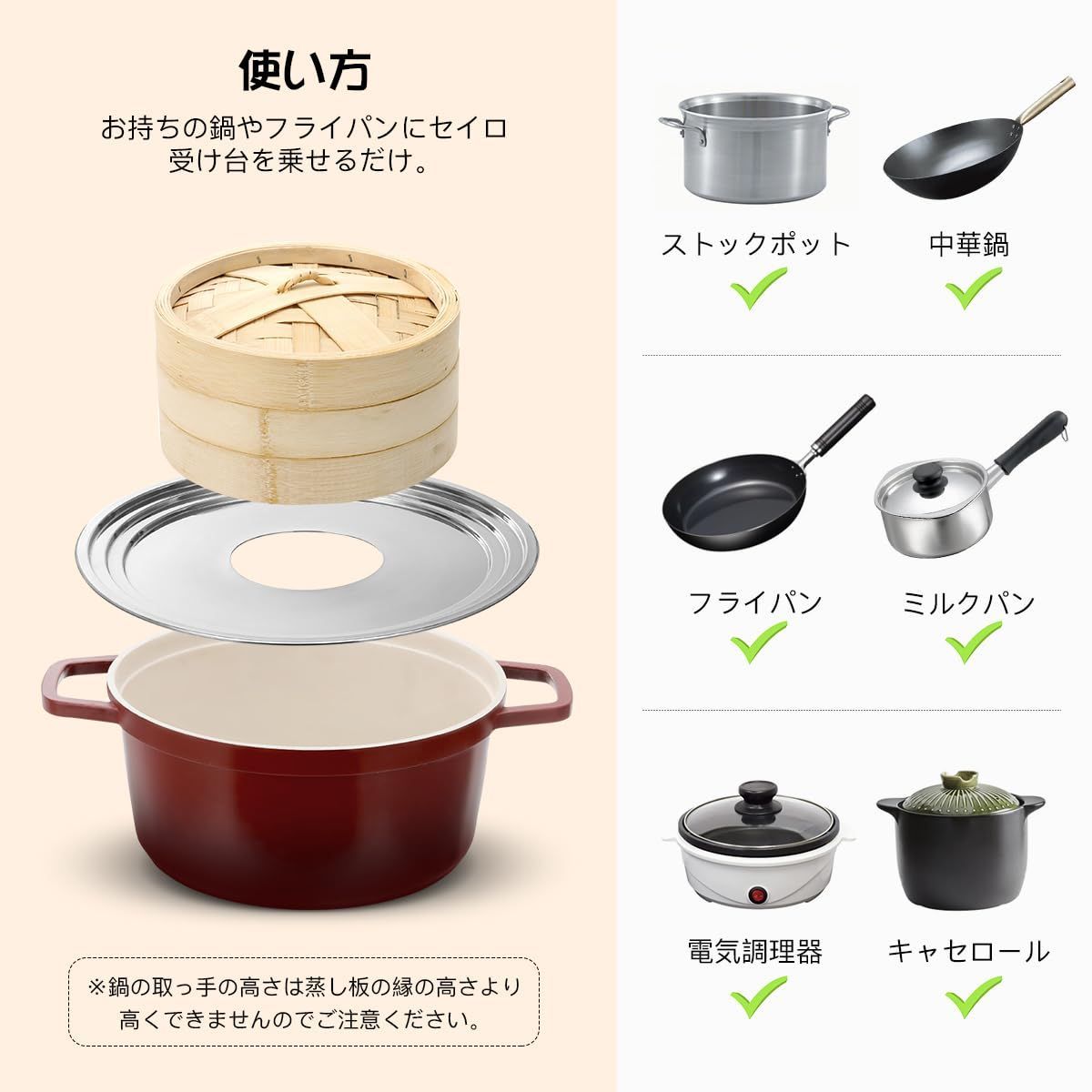 【適用サイズ】階段状のデザインは直径20-24-27cmの鍋に対応しております。せいろ蒸し器の中の蒸し穴は9cm、直径10~25cm(15cm 18cm 21cm 24cm含む)のセイロに対応します。(※21cm以上のせいろはうまく入らない場合がありますのでご注意ください)