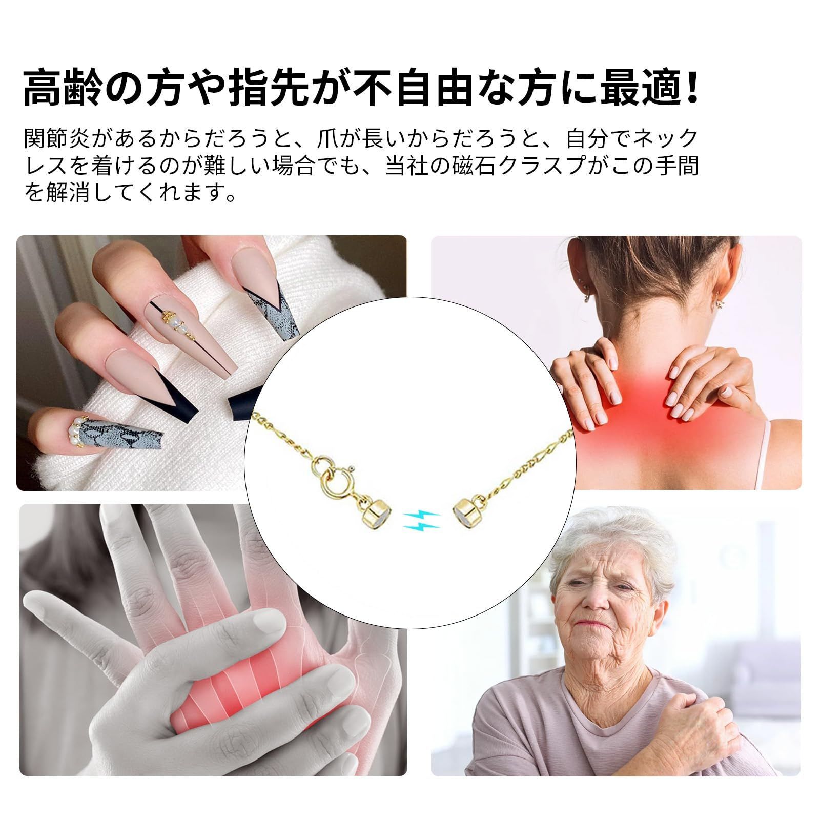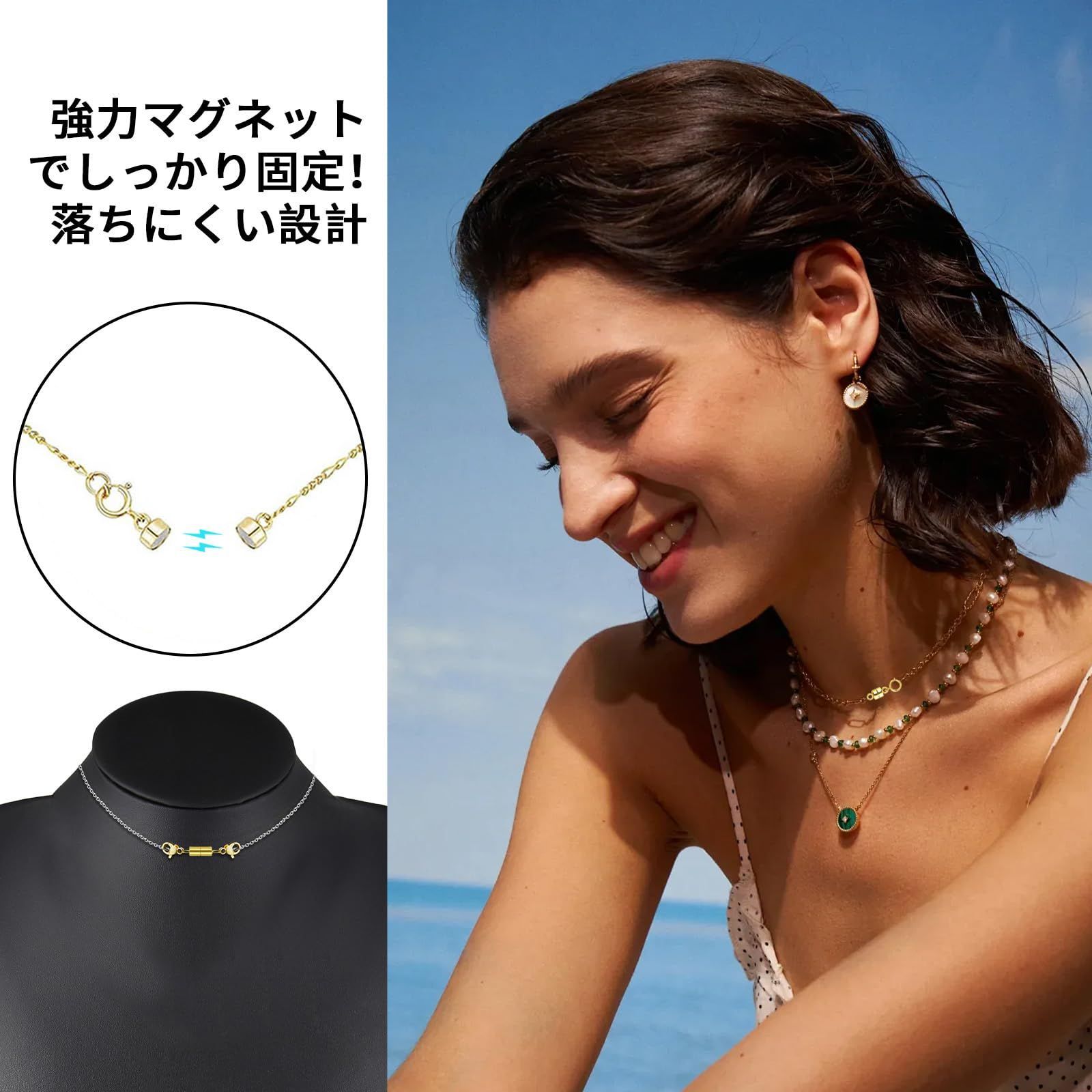 強力マグネットを採用し、ネックレスやブレスレットの着脱がワンタッチで簡単に。忙しい朝や外出先でも手間取らず、片手でラクに留め外しが可能。細かい作業が苦手な方や高齢の方にも最適で、毎日の装着ストレスを大幅に軽減します。