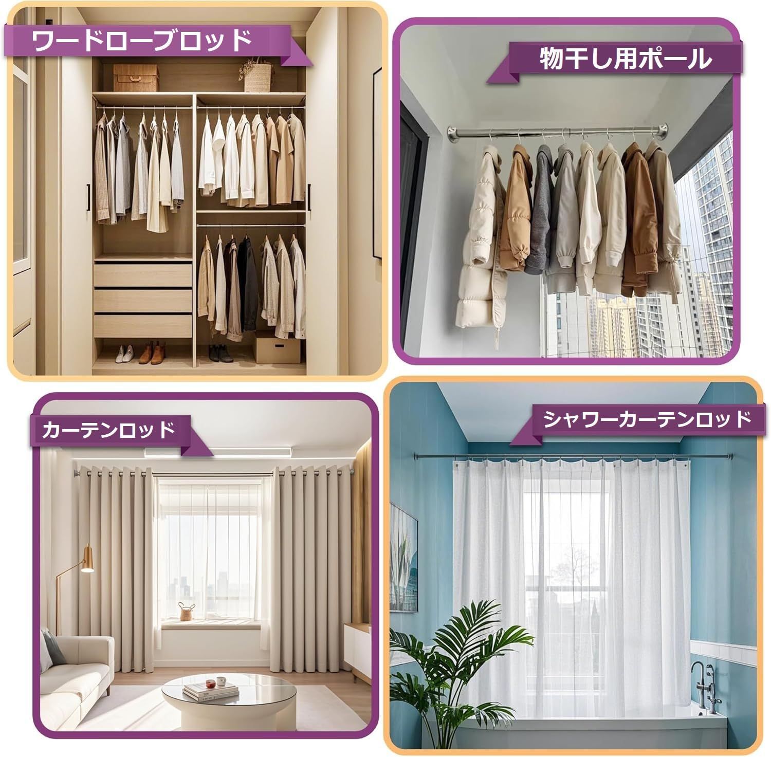 「幅広い用途」:クローゼットロッドやキッチン吊りロッドサポート、乾燥ラック、カーテンロッド、物干し竿、浴室のシャワーロッドなど、さまざまな場所で活躍します。