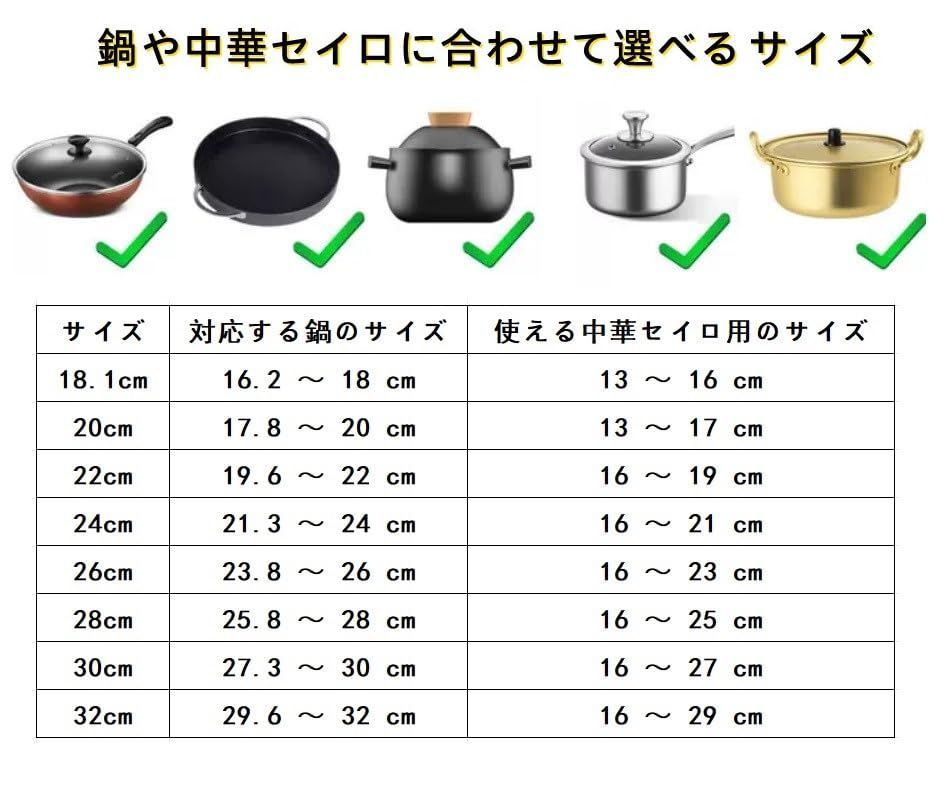 【せいろ蒸し器 - サイズ】小さめの20cm~サイズの32cmまで対応しているので、使いたいせいろの大きさと家にある鍋の大きさなどを参考にしながら、ぴったりなサイズの蒸し板をお選びください。