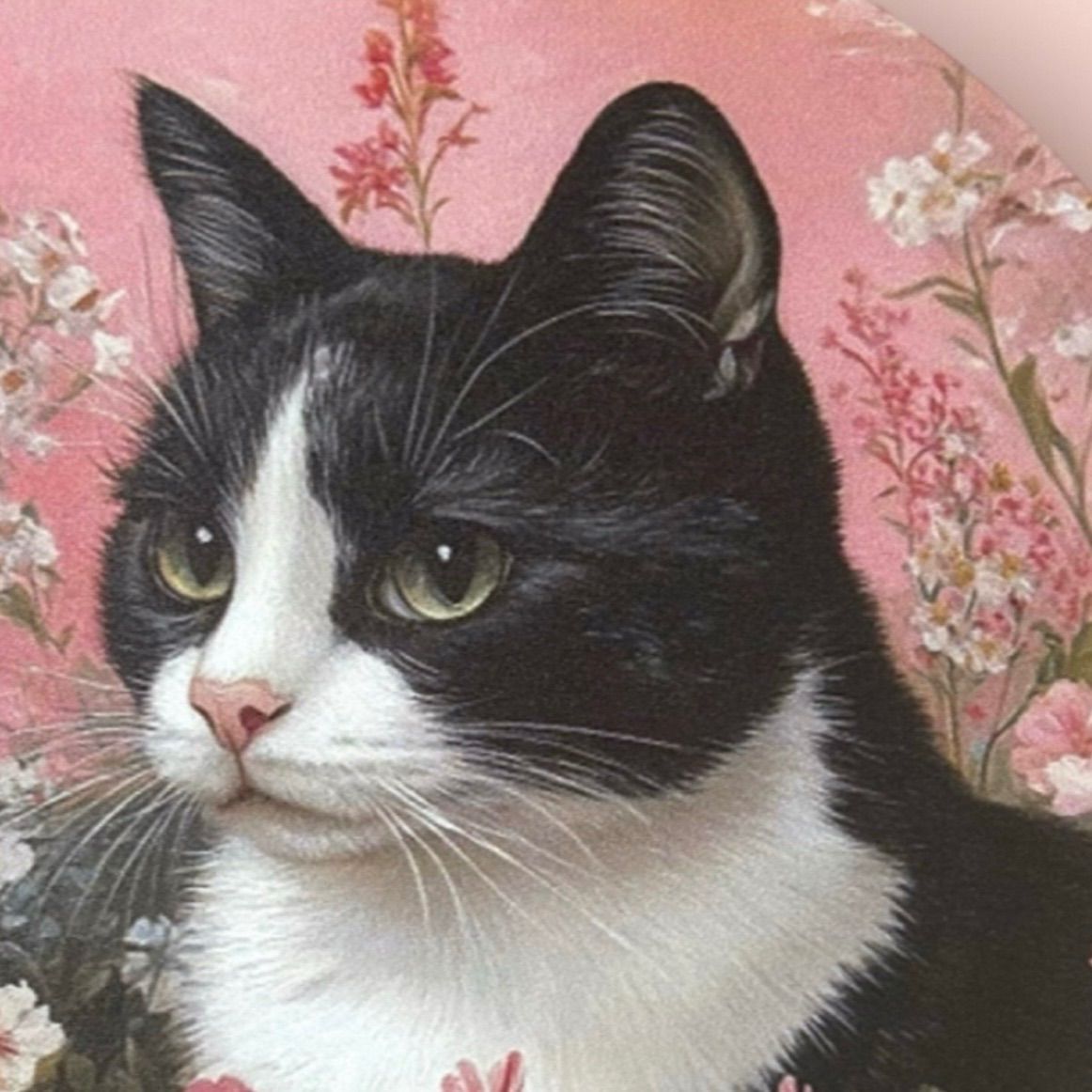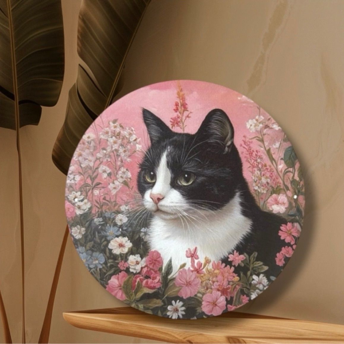 ピンクのお鼻の可愛いハチワレ猫ちゃんが(タキシード猫ちゃん)美しいお花に囲まれているアートの丸型サイン(看板)です。