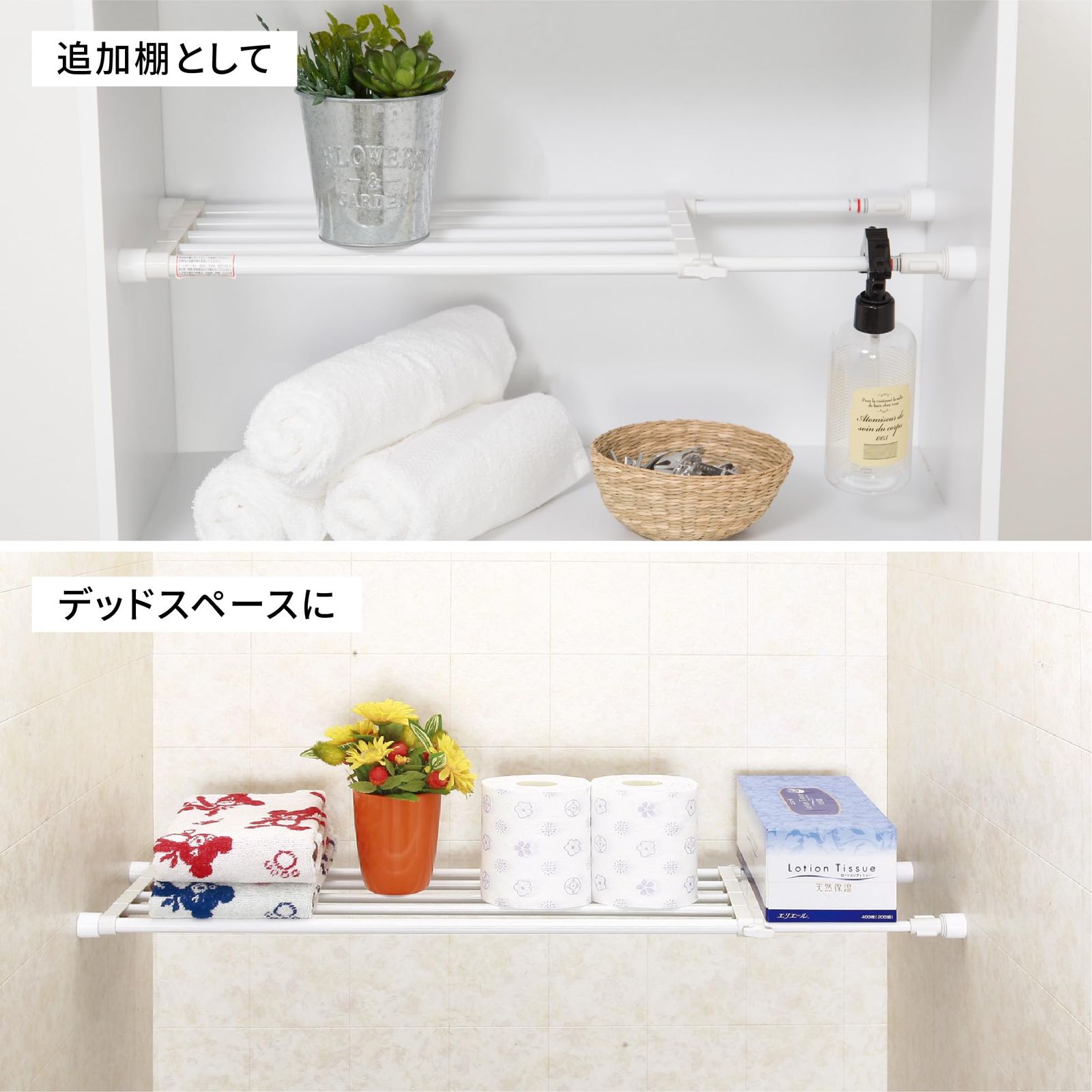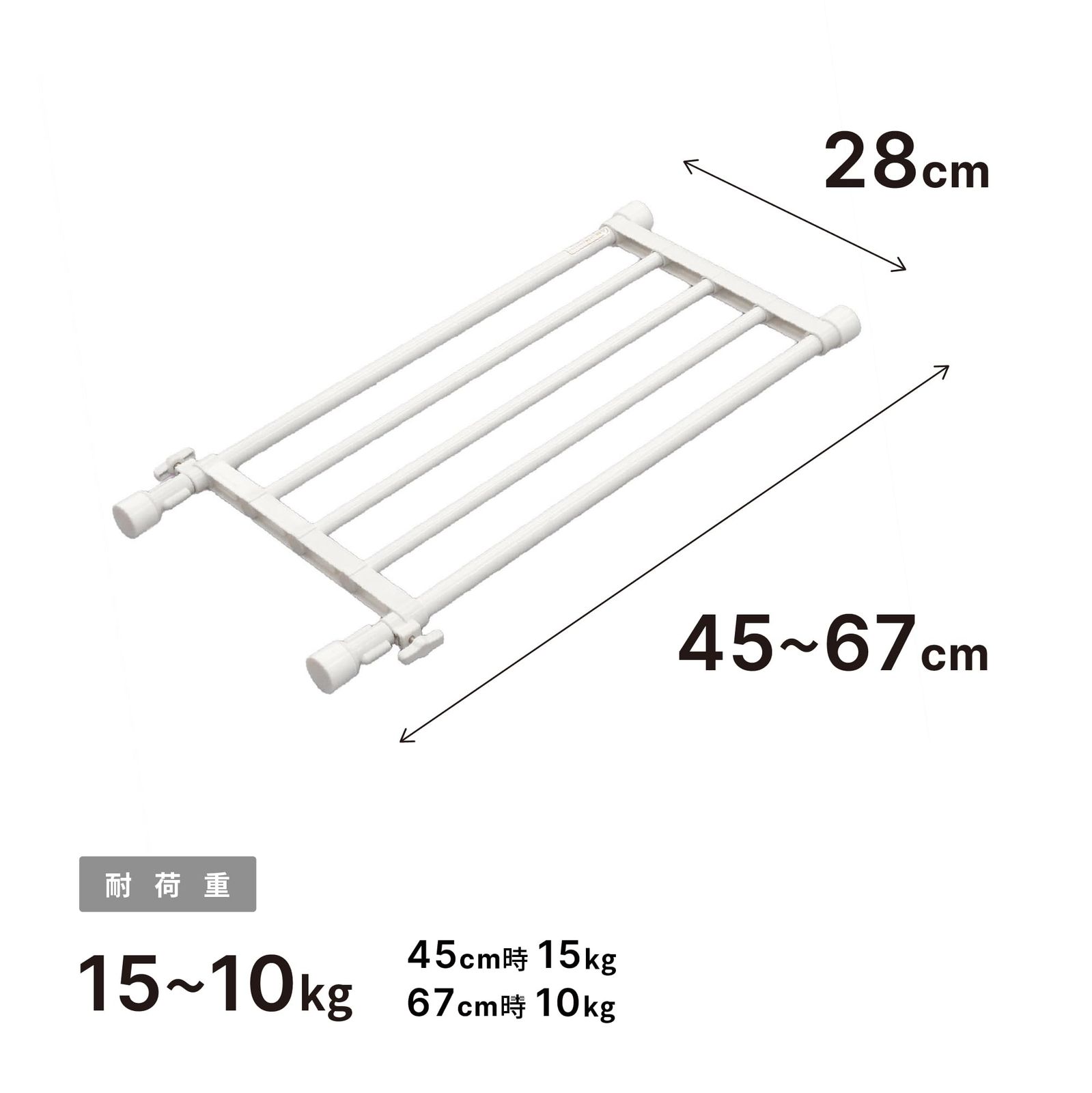 【サイズ】幅45-67×高2.5×奥行23cm(棚部奥行20.5cm) 【取付幅】45~67cm 【耐荷重】45cm時15kgまで/67cm時10kgまで 【本体重量】0.3kg【カラー】ホワイト 【材質】〈パイプ〉鉄・エポキシ樹脂粉体塗装 〈樹脂部分〉ABS樹脂・合成ゴム 〈ねじ類〉鉄・メッキ ネジ・釘不要・取り付け取り外しが簡単 いろんな空間を簡単にムダなく効率化できる突っ張り棚。段差のある壁にも取り付けできる。