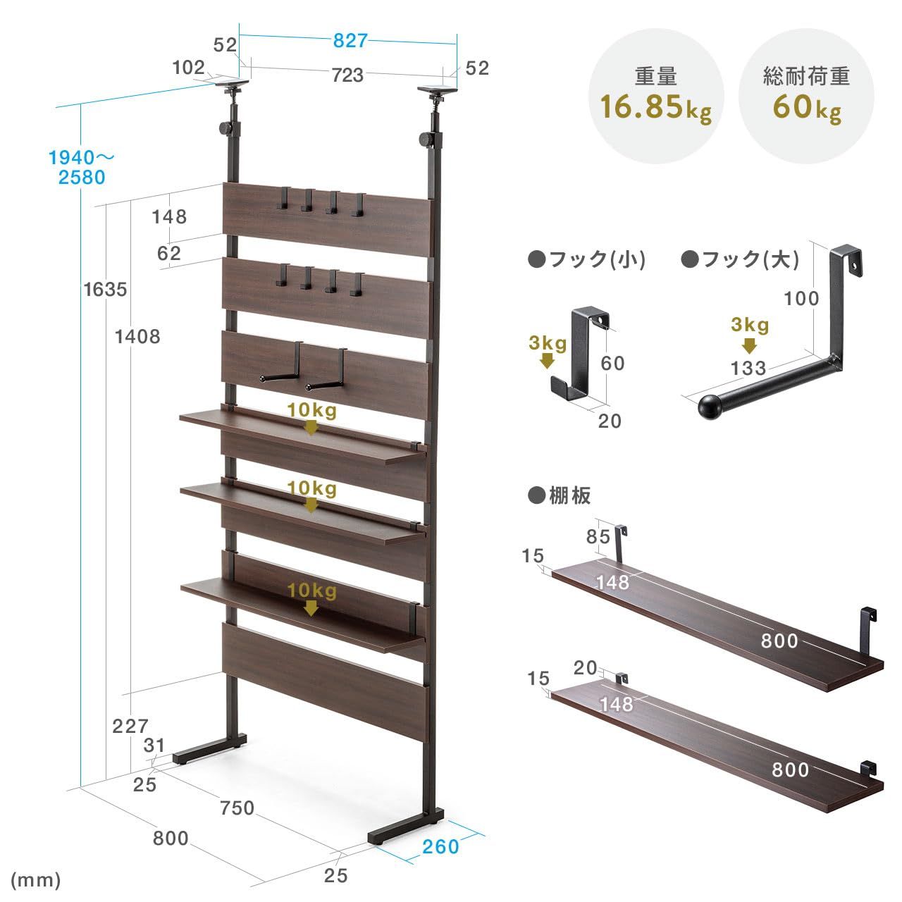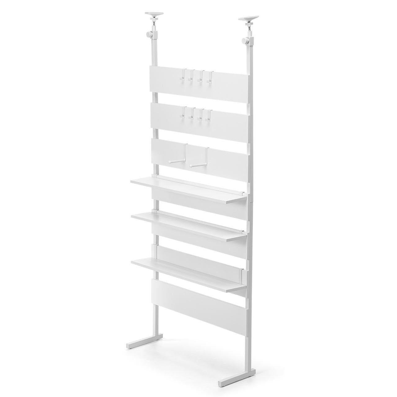 工事不要の突っ張り式で、床と天井があればどこでも設置ができる ウォールラック です。お部屋の間仕切り( パーテーション )としても設置ができます。 引っ掛け 収納 に便利なフックは10個(大×2個、小×8個)付属しています。また、棚置き収納ができる棚板は3枚付属しています。 突っ張り棒 の上部には滑り止め付きの大型パッドと強力なバネが付いており、しっかり 突っ張り ます。 L字の脚で安定した設置ができます。微調整のできるアジャスター付きです。 期間:初期不良のみ