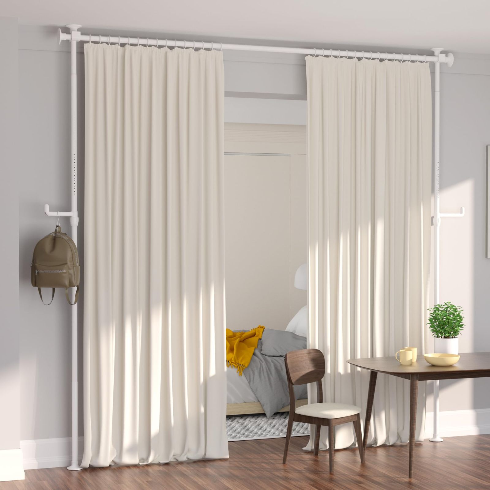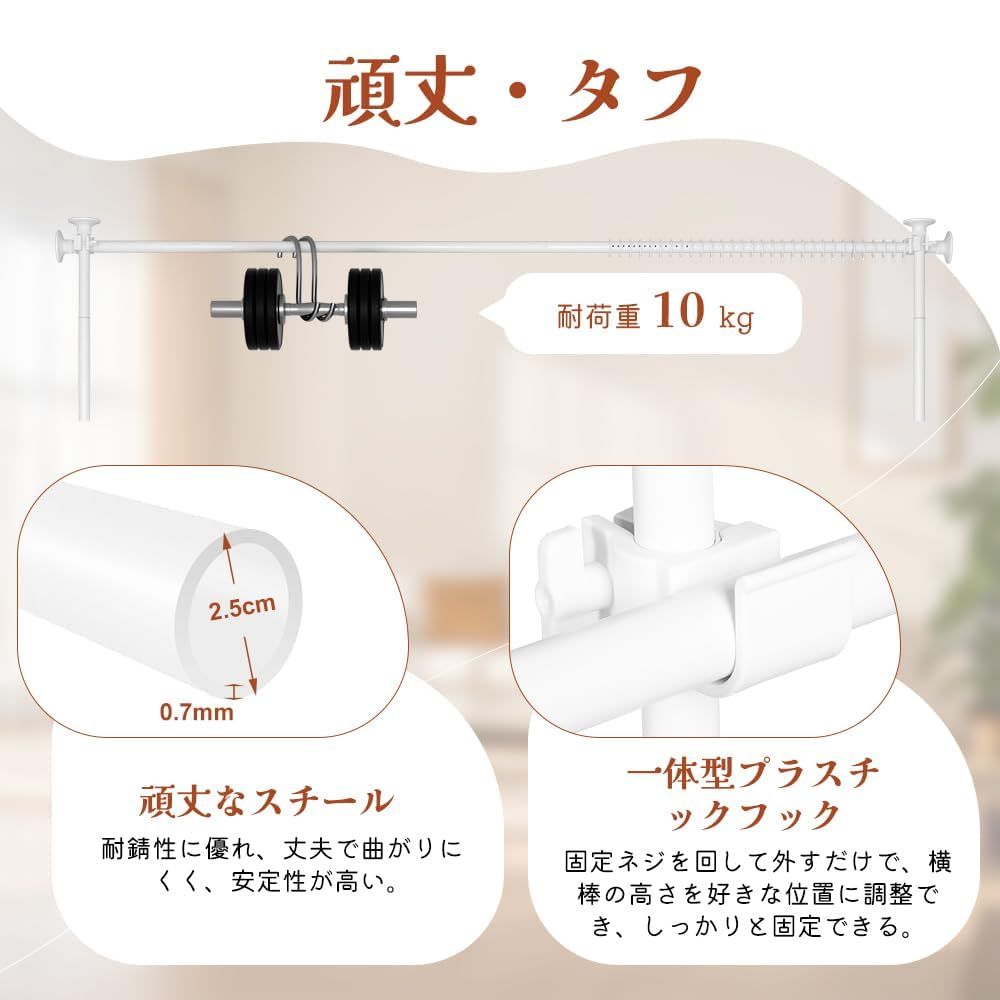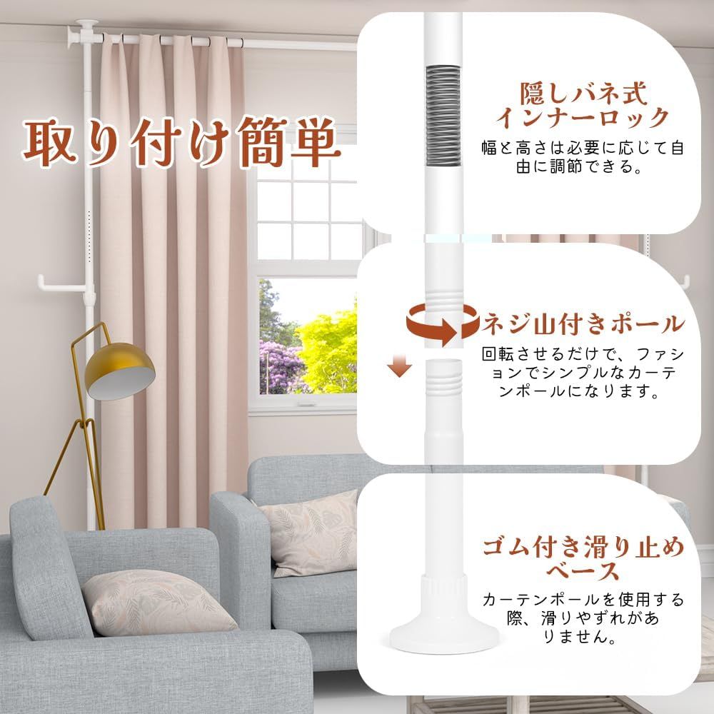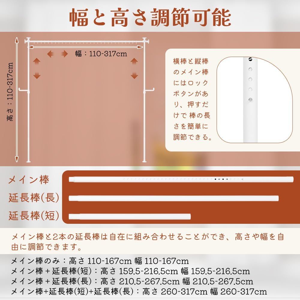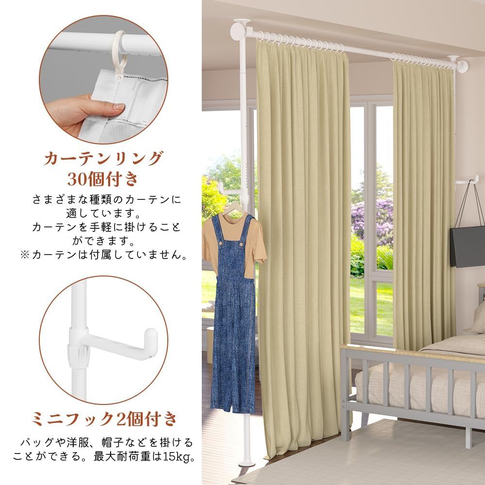 つっぱり式で工事不要:KELIXUパーテーションはつっぱり縦棒でできており、壁や天井を傷つける穴あけ加工を施していません。タイル床、木製床、しっくい天井、ポップコーン天井、テクスチャー天井など、どんな硬い表面にも適しています。シングルル-ムや賃貸住宅、寮などに最適です 縦横伸縮可能:横棒と縦棒のメイン棒と延長棒の本数によって、カーテンレール突っ張り式の高さと幅を調節できます。また、メインバーのロックボタンを押すことで、ポールの長さを簡単に調節できる。メイン棒のみ:110-167cm、メイン棒+延長棒(短):159.5-216.5cm、メイン棒+延長棒(長):210.5-267.5cm、メイン棒+延長棒(短)+延長棒(長):260-317cm 頑丈なつっぱり棒カーテン:KELIXUパーテーション間仕切りは、丈夫なスチール製で耐久性に優れています。直径2.5cmのカーテンポールは耐荷重10kgで、安定性に優れています。また、カーテンを吊りやすくするために、スムーズに可動する30個のカーテンリングをご用意しています。遮光カーテン、モスリンカーテン、ロッドポケットカーテン、タブカーテンに適しています 様々な用途:ミニフックが2つ付いており、この突っ張りパーテーションにバッグや洋服、帽子などを簡単に掛けることができます。カーテンポールつっぱり式は、部屋の間仕切り、子供部屋、洗濯物干し、ハンガーラックに使用できます。空間を区切り、スペースを有効活用し、あなたのプライバシーを守ります 軽量で簡単設置:当社のまじきりカーテン突っ張り棒式には、必要な付属品、分かりやすい説明書、取付ビデオがすべて含まれています。また、カーテンポール仕切りの内側にネジ山があるため、工具を使わずにロッドを回転させるだけで簡単に取り付けられます。カーテンロッドは、おしゃれでいろんな装飾スタイルに合います 注意:カーテンは付属していません