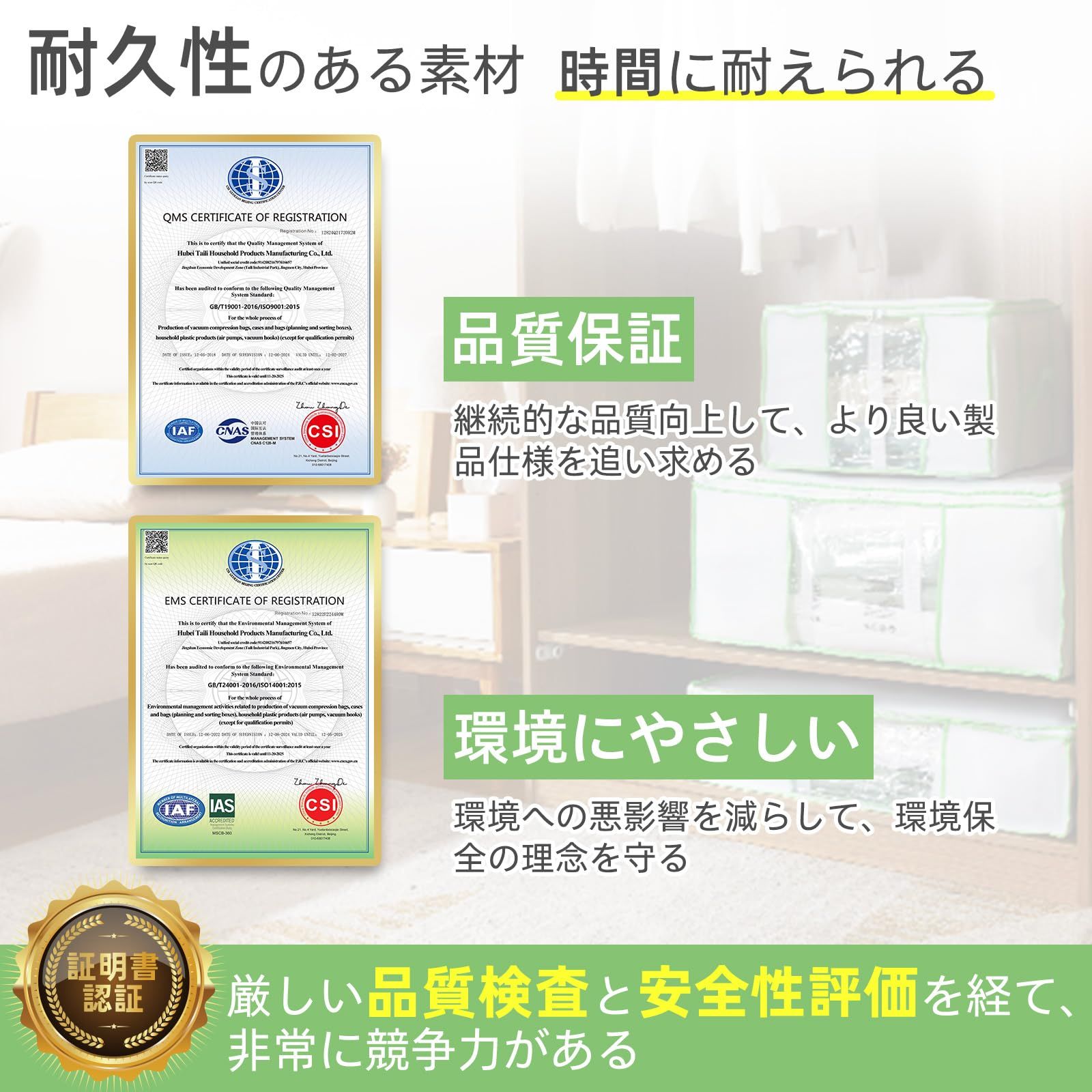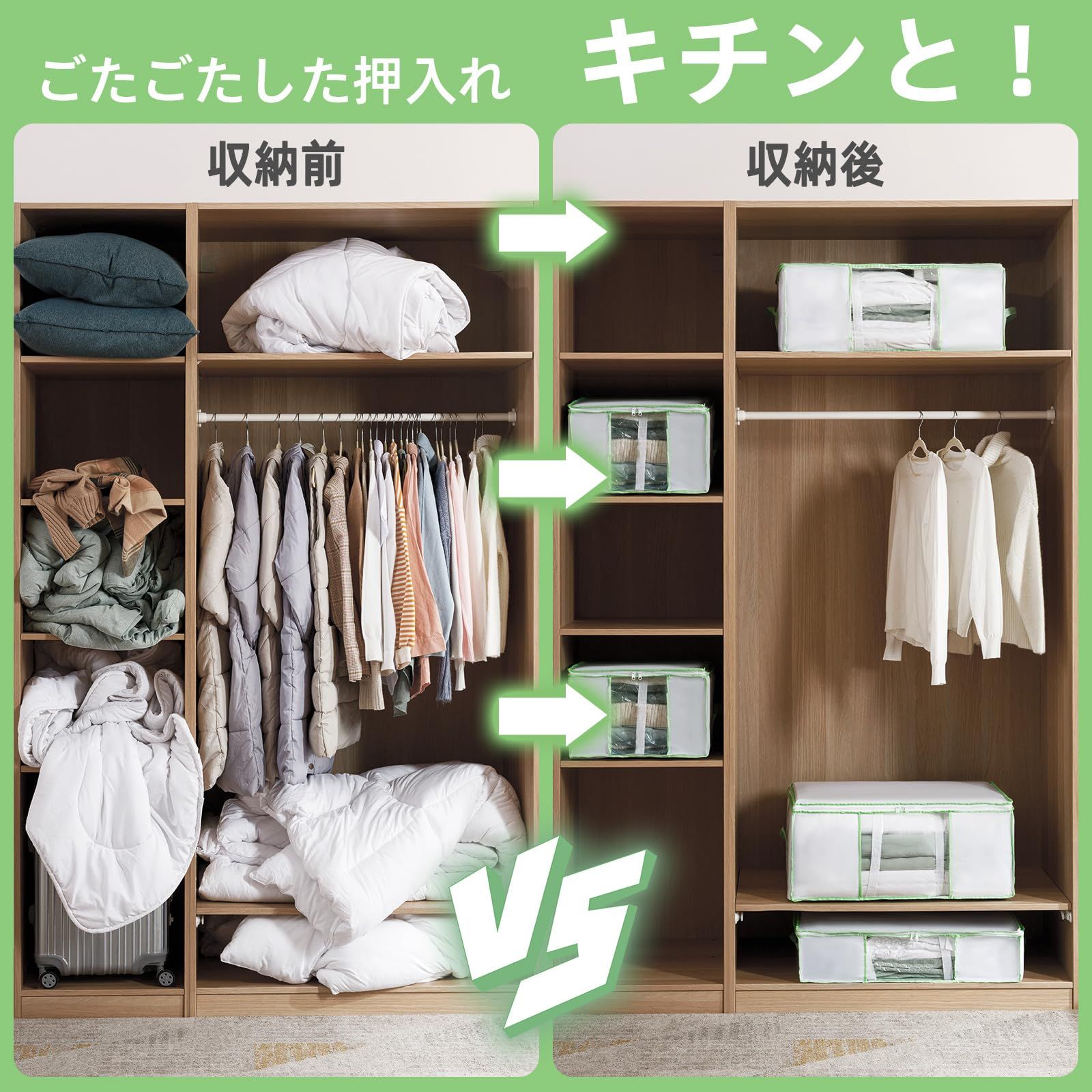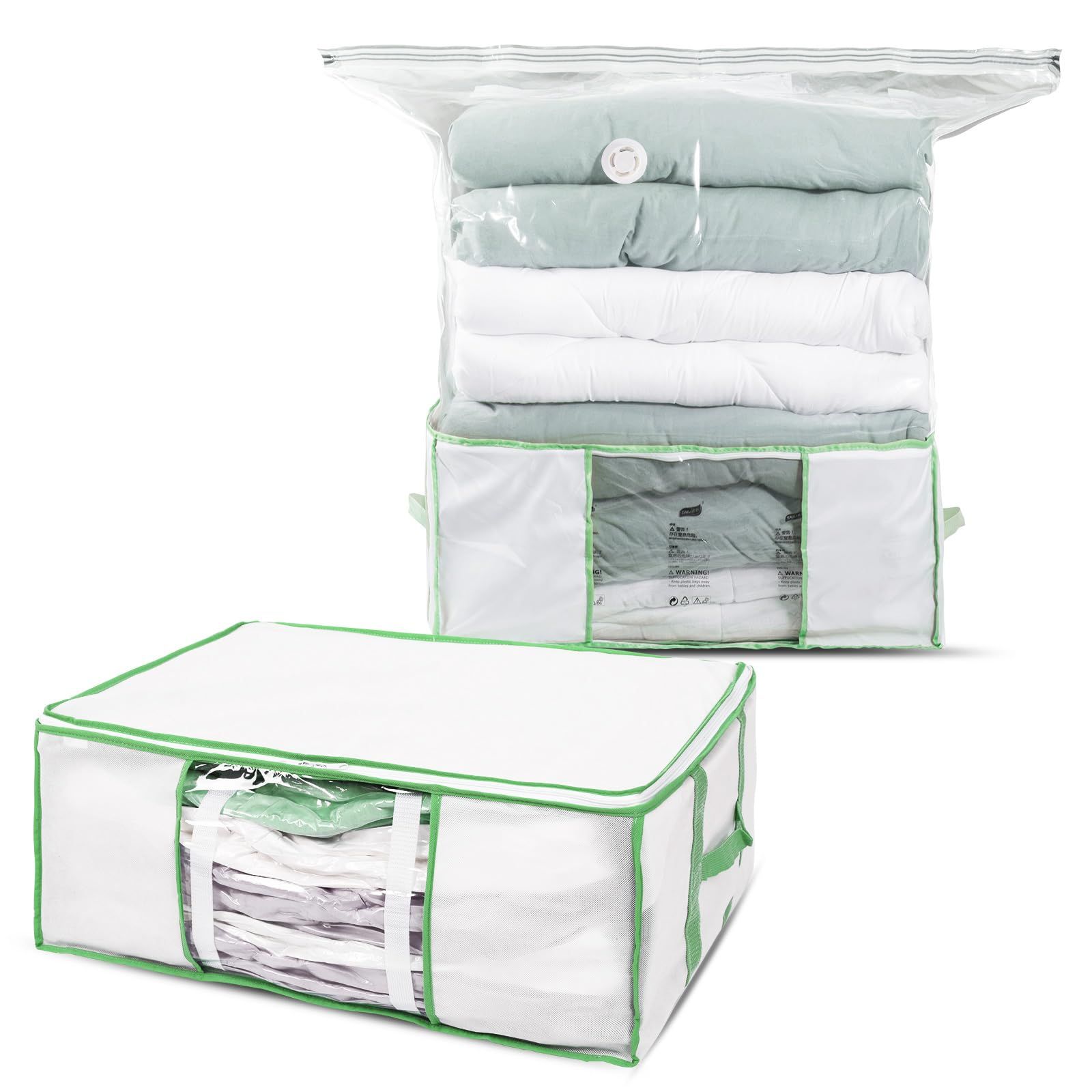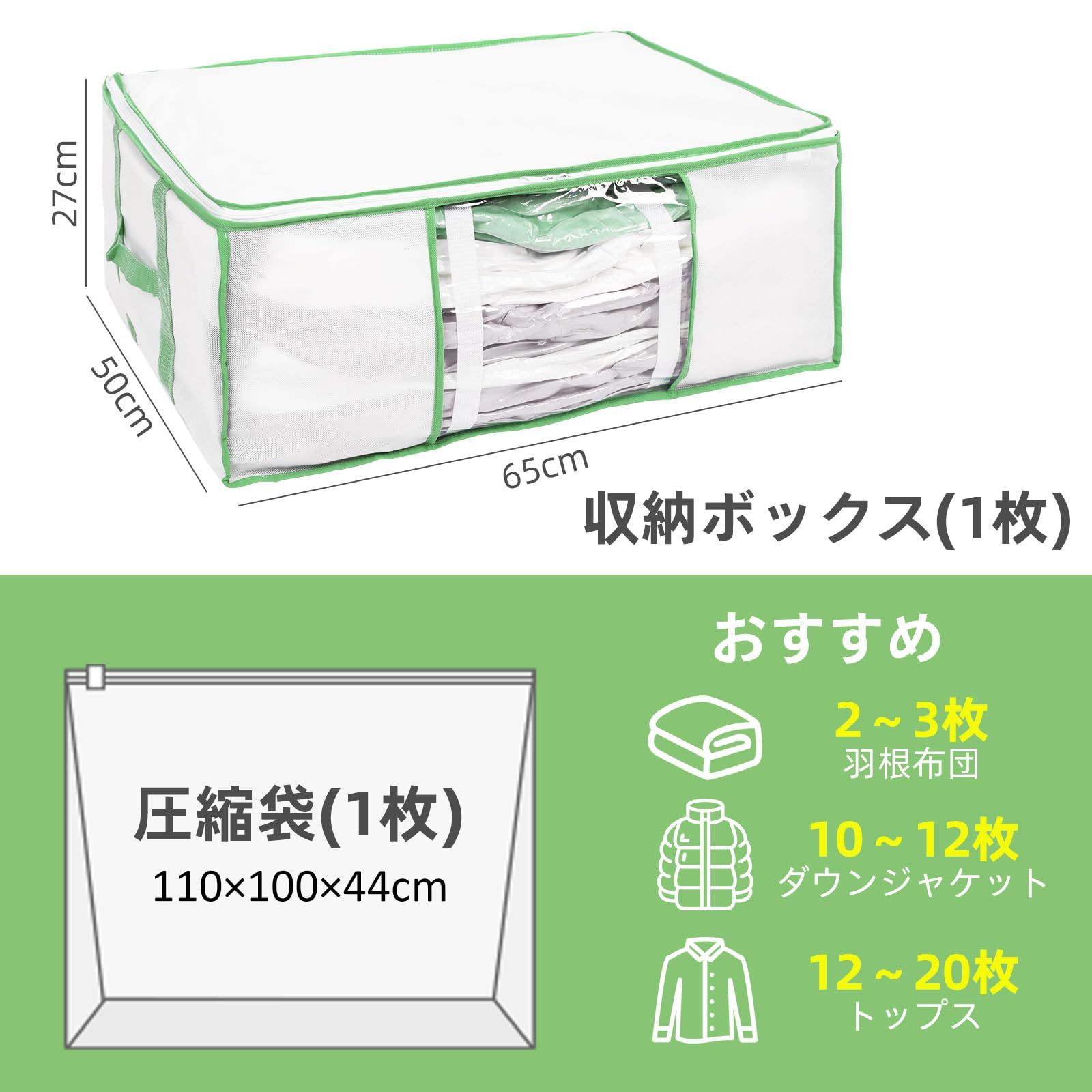 大容量:収納ボックス(1枚):65 x 50 x 27 cm 圧縮袋(1枚):110 x 100 x 44 cm。収納目安:掛け布団を3枚くらい、衣類を12枚くらい、ぬいぐるみを12個くらい収納できます。圧縮袋と収納ケースが一体に,容量を減らすだけでなく、クローゼットの中に美しく収納することができます 特別な設計 :収納ボックス収納物が一目で分かる便利な透明窓付きます、内部には留め具用のカラビナも付いています。圧縮袋は2色のジッパーを採用しており、ジッパーの密封を容易にするスライダーが付いており、色の変化によりジッパーが完全に密封されているかどうかをすぐに確認できます 耐久性のある材質:収納ボックスの内部に丈夫なプレートが支えて、型が崩れにくくて、何個のボックスを積み重ねることができます。収納ボックスと圧縮袋がぴったりとフィットし、安定して変形しません。柔軟な素材で、丈夫で耐久性があります。革新的なエアバルブで、操作がより便利になります。圧縮バッグは一方向弁を採用しており、気密性があり、あらゆる掃除機に対応しています 二重保護:収納ケースは防水生地を採用して、湿気、ほこりや害虫の侵入を防ぎます。そして、圧縮袋はPA+PEの耐久性のある材質を採用し、袋体は防水防湿防塵防カビ防虫、衣類をよく保護し、保管時間が長く、繰り返し使用することができる。袋体の空気漏れを発見した場合、まず密封骨条が変形しているか、袋体が完全であるか、バルブ口が塞がれているかどうかをチェックしてください。ヒント:羽毛素材の衣類をバルブ口に近づかないでください。そうしないと抽気圧縮が困難になります さまざまなシーンでの応用:収納ボックスの底とコンプレッションバッグはベルクロで固定でき、それぞれ別々に使用できます。 使用しないときは折りたたんで収納できるので、スペースを節約できます。折りたたみ設計、外出や日常の収納に便利です。両側に取っ手があり、使用時に持ち上げやすくなっています。クローゼット収納、布団枕収納、ぬいぐるみ収納、季節の変わり目収納、引っ越しなど、さまざまな場面で使用できます