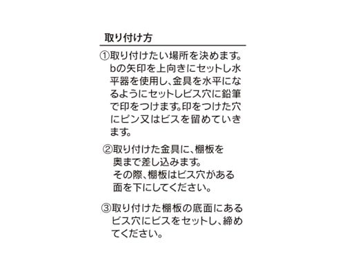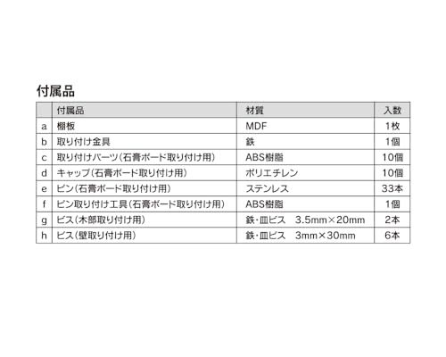 1.棚受 / MDF 2.取付金具 / 鉄 3.取付パーツ(石膏ボード取付用) / ABS樹脂 4.キャップ(石膏ボード取付用) / ポリエチレン 5.ピン(石膏ボード取付用) / ステンレス 6.ピン取付工具(石膏ボード取付用) / ABS樹脂 7.ビス(木部取付用) / 鉄・皿ビス 3.5x20mm 8.ビス(壁取付用) / 鉄・皿ビス 3x30mm 9.ビス穴隠しシール
