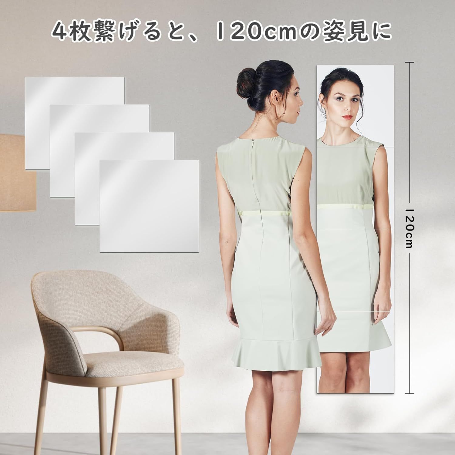 【4枚セットで完璧な全身映し】28cm×30cm鏡面4枚を縦に並べると、高さ120cm×幅28cmまたは高さ112cm×幅30cmの全身鏡を実現します。また、4枚の鏡を自由に組み合わせることで、多様なニーズに対応することができるため、玄関や浴室、更衣室など、あらゆる場所で活躍します。28cm×30cmは正方形ではないので、セット時は設置方向にお気を付けください。
