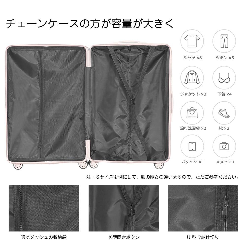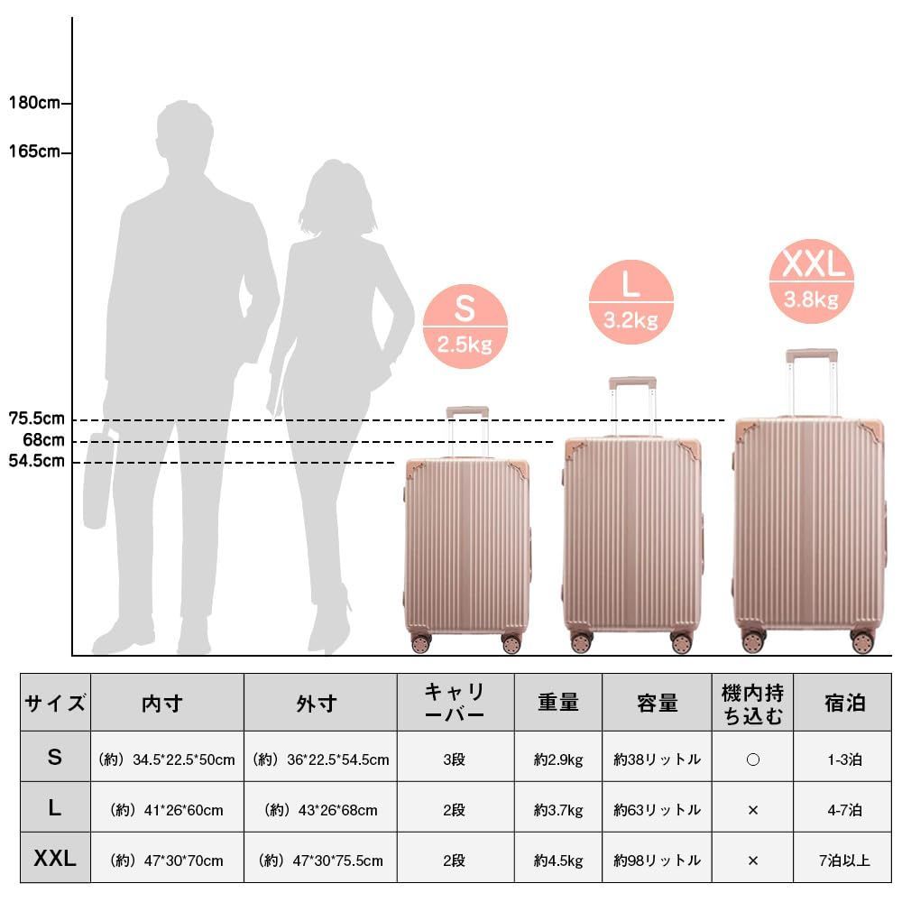【サイズ】Sサイズの内寸は50*34.5*22.5cm、重さ:2.5kg 超軽容量、は38リットル、1~3泊に似合います。Sサイズは一部の航空会社だけに適用しますので、事前に航空会社に確認したほうがいいんです。Lサイズの内寸は60*41*26cm、重さ:3.2kg 、容量は63リットル、4~7泊以上。XXLサイズの内寸は70*47*30cm、重さ:3.8kg、 容量は98リットル、7泊以上