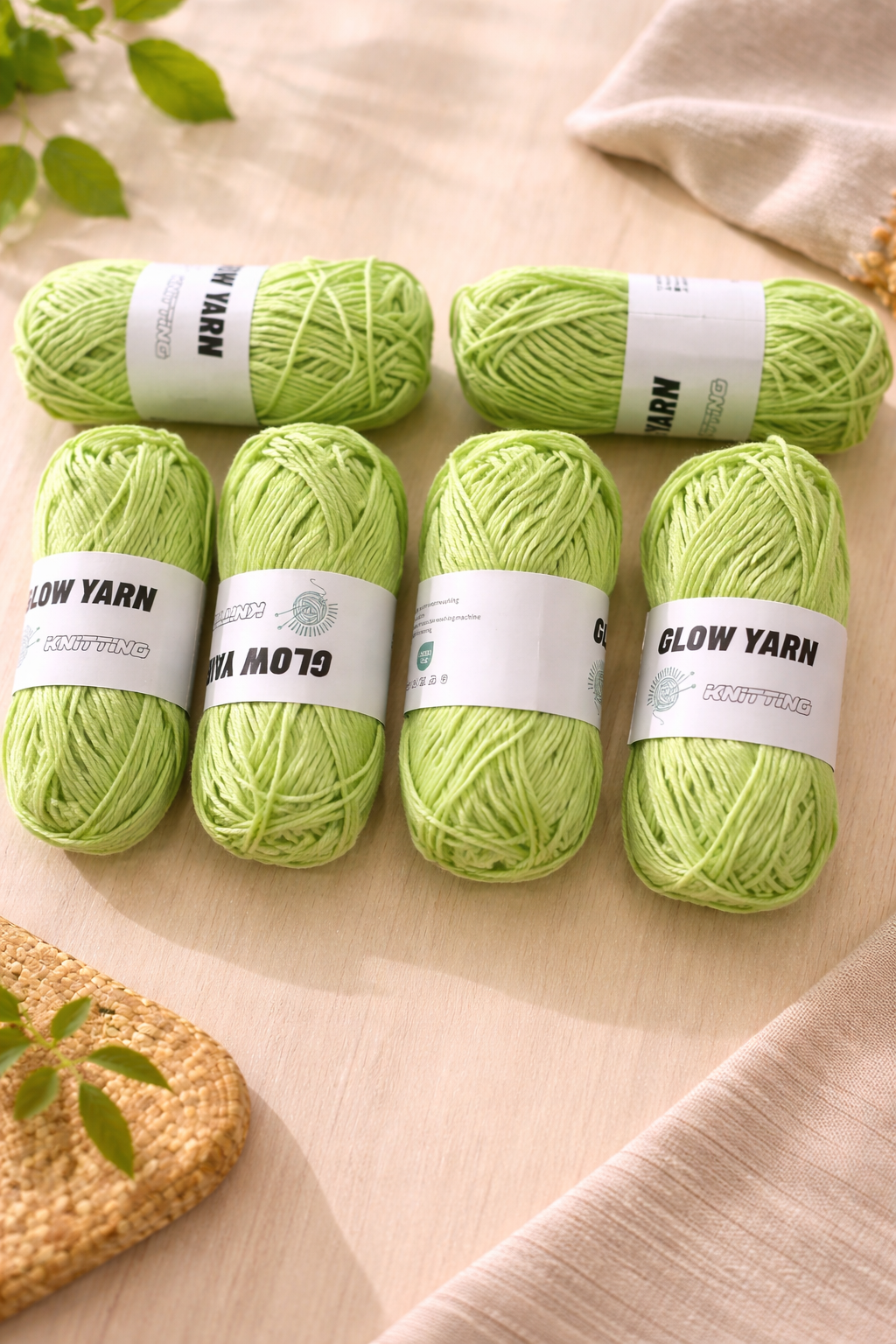 鮮やかなライトグリーンが目を引く夜光毛糸6玉セットです。