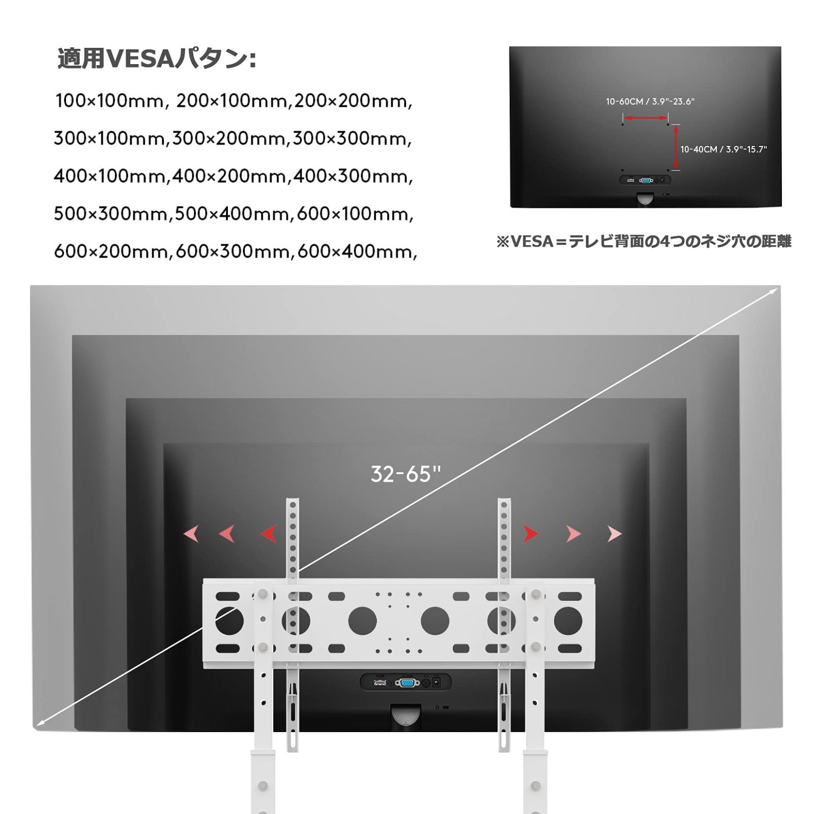 【幅広く対応】32~65インチの大型テレビ/モニターに対応できます。VESA規格(テレビ背面のネジ穴間の距離)が100x100mmから600x400mmまで対応可能で、ほとんどのテレビに対応できます。【仕様】本体サイズ:幅45.5cmx奥行31cmx高さ132.5cm 本体重量:約7kg 耐荷重:40kg
