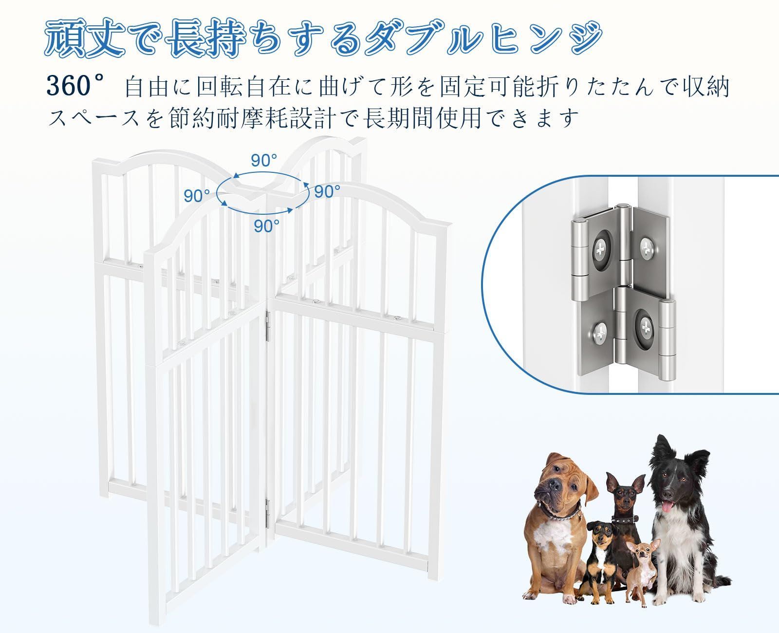 【柔軟な折りたたみ機能】: 私たちのペットフェンスは、両面折りたたみシステムデザインと360°回転ヒンジを備えており、Z字型に折りたたむことができます。アコーディオンのように素早く展開できるため、設置や収納が簡単です。さまざまなサイズのスペース、階段、廊下、またはドアの開口部に合わせて簡単に配置できます。また、使用しないときは簡単に収納できます。