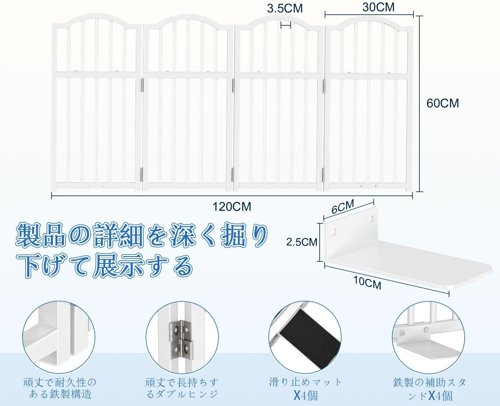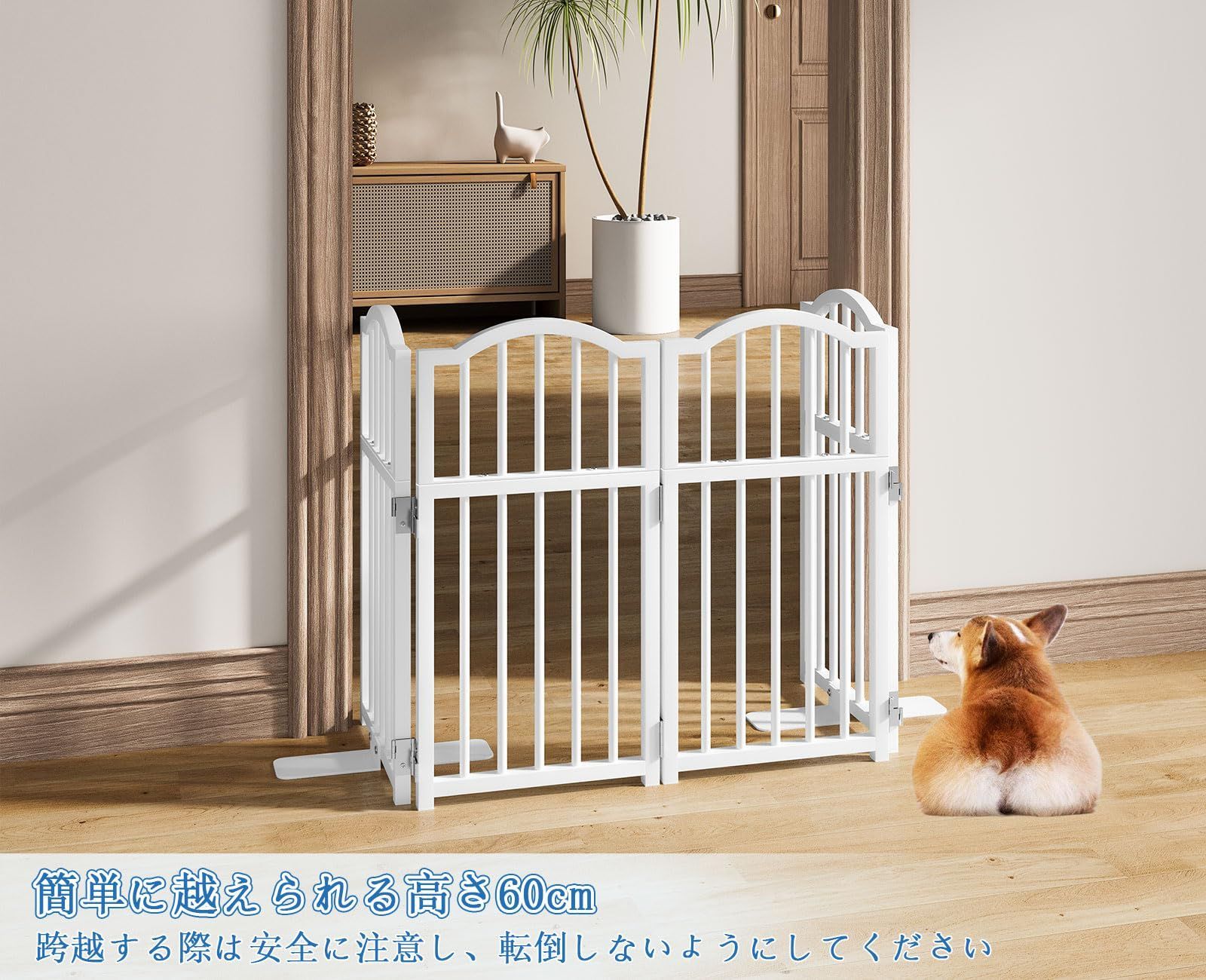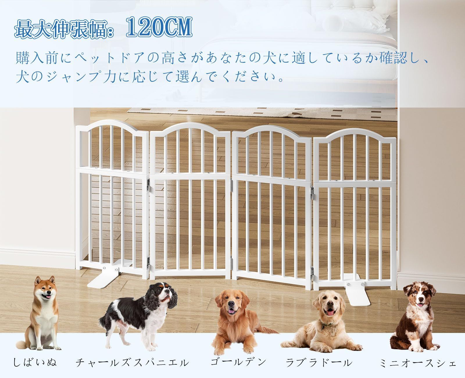 【子犬に最適】: 開口サイズ: 長さ120cm、高さ60cm。このペットゲートは、便利なまたぎ越えデザインで、小さなペットの動きを効果的に制限しつつ、大人や高齢者が簡単に通り抜けられるように設計されています。バー間の間隔は3.5cmで、バーの間隔が狭いため、小型犬が隙間を通り抜けるのを効果的に防ぎます。子犬、高齢のペット、またはジャンプ力の低いペットに最適です。