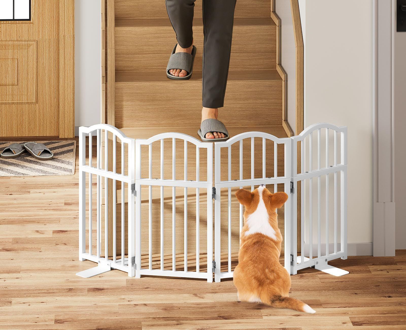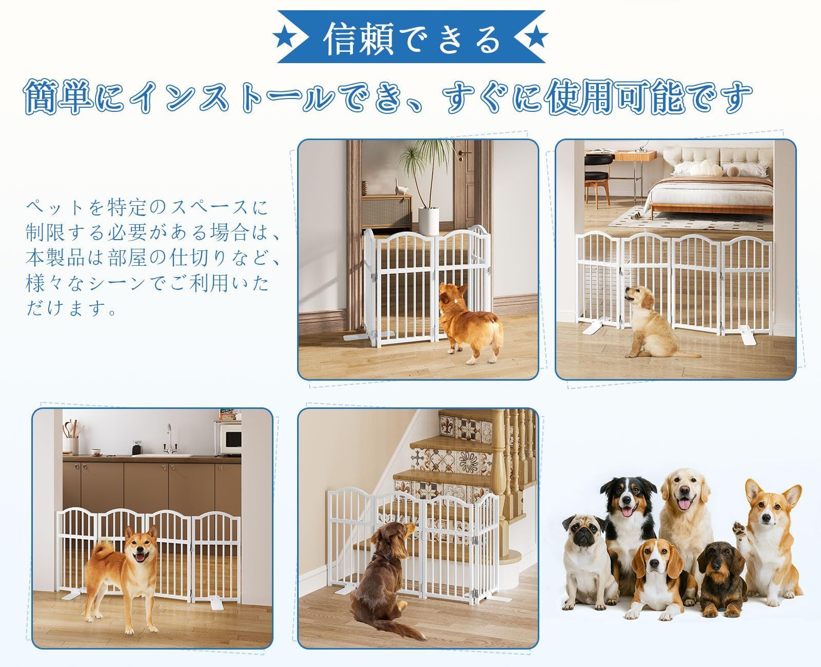 【使いやすさと収納の簡単さ】: この犬用ゲートは、革新的な折りたたみ式および拡張可能なデザインを特徴としており、壁やドアに穴を開ける必要がなく、家庭環境を保護します。サイドパネルを左右に広げるだけで、必要な場所に簡単に設置できます。使用しないときは、ベッドやソファの下、またはドアの後ろにコンパクトに折りたたんで素早く収納でき、便利で省スペースのメリットを提供します。