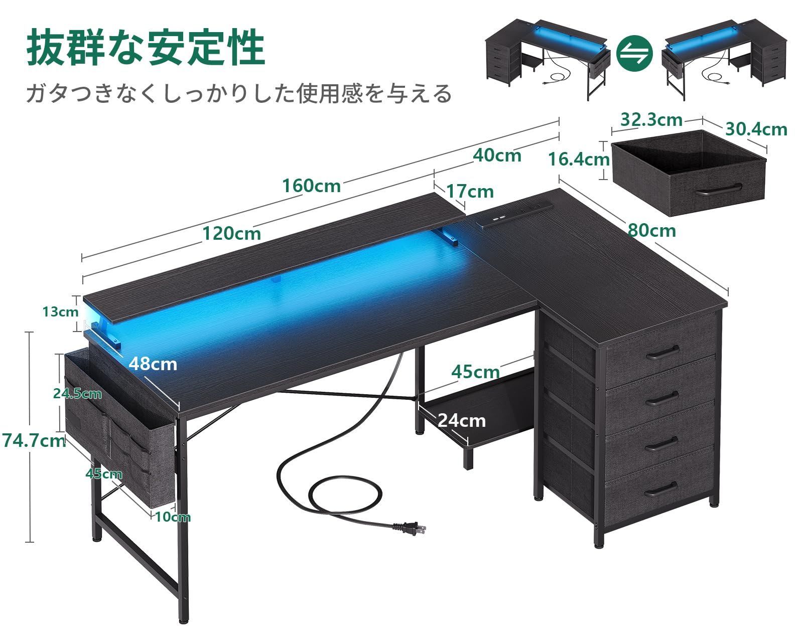 AODK ゲーミングデスク パソコンデスク l字デスク 引き出し&コンセント付き 幅160×奥行80cm 机 pcデスク ゲームデスク LED付き gaming desk l shaped 在宅ワーク/オフィス用 左右入れ替え対応 ブラック