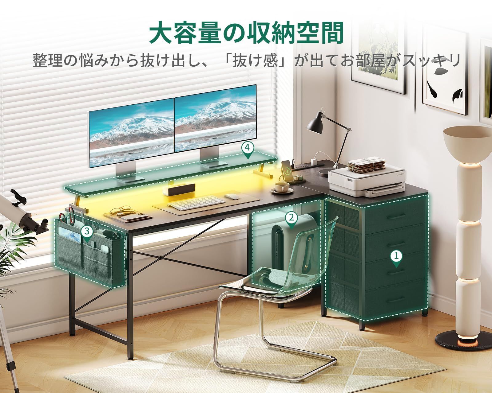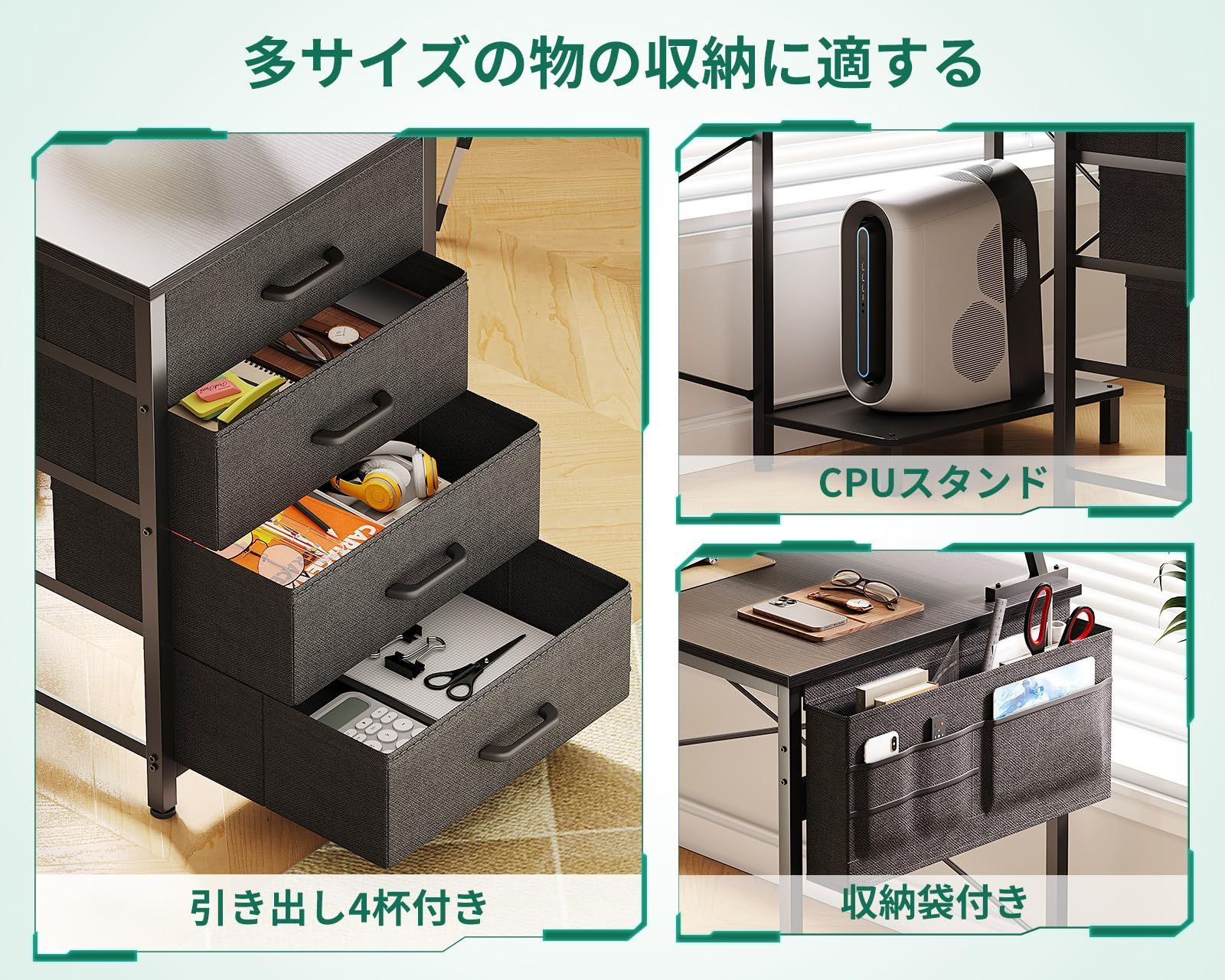 【究極の収納デスク、多サイズの物の収納に適する】布製の引き出し4杯+CPUスタンド+収納袋、限られた空間で収納効率が大幅にUP。MDFボードを内蔵した引き出しは重い物を入れても変形しにくい。プライバシーを保護し、ほこりが落ちるのを防ぐ。デスク周りをちゃんと整頓いただけ、お部屋がスッキリ。
