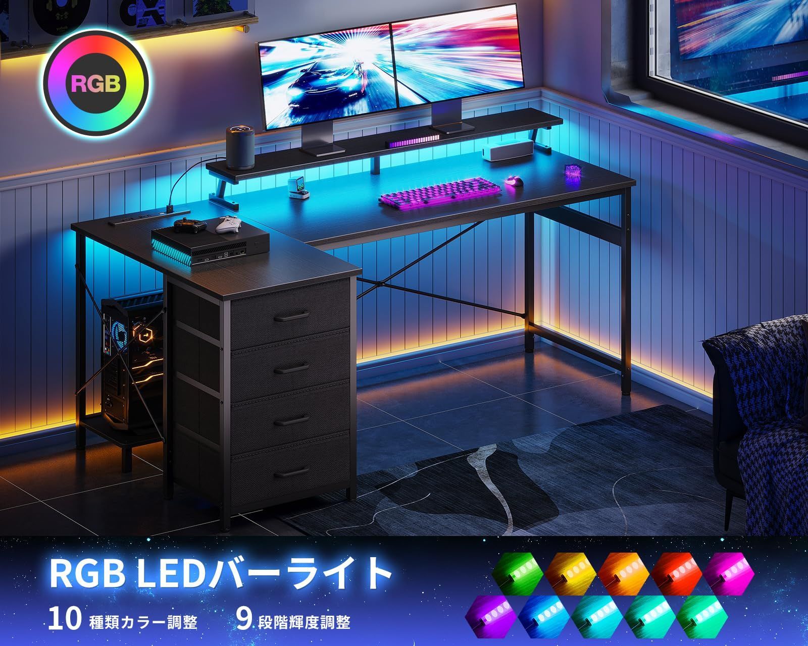 【LED付きデスク、お部屋の雰囲気が変わる】ゲームテーブルには10段階調色・9段階調光のRGBバーライトを搭載しており、気分やシーンに合わせてカラーを切り替えることができる。より頑丈で長持ちやすい。臨場感にあふれるゲーム雰囲気だけではなく、温かみのある学習・仕事環境も作り出せる。