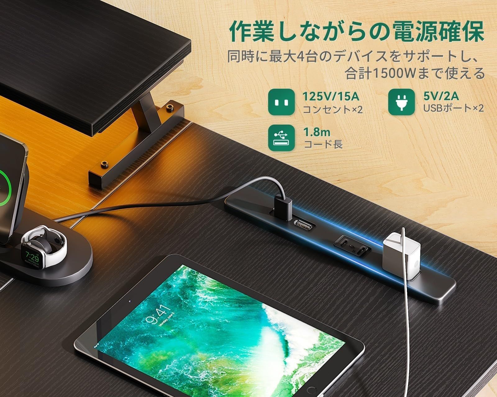 【コンセント付きデスク、作業しながらの電源確保】ワークデスクにはコンセント2口+USBポート2口が付いている。同時に最大4台のデバイスをサポートし、合計1500Wまで使える。手近なところで電源が取れ、スマホやタブレットなどの充電が便利になり、電池残量を気にせずに長時間の作業が可能。