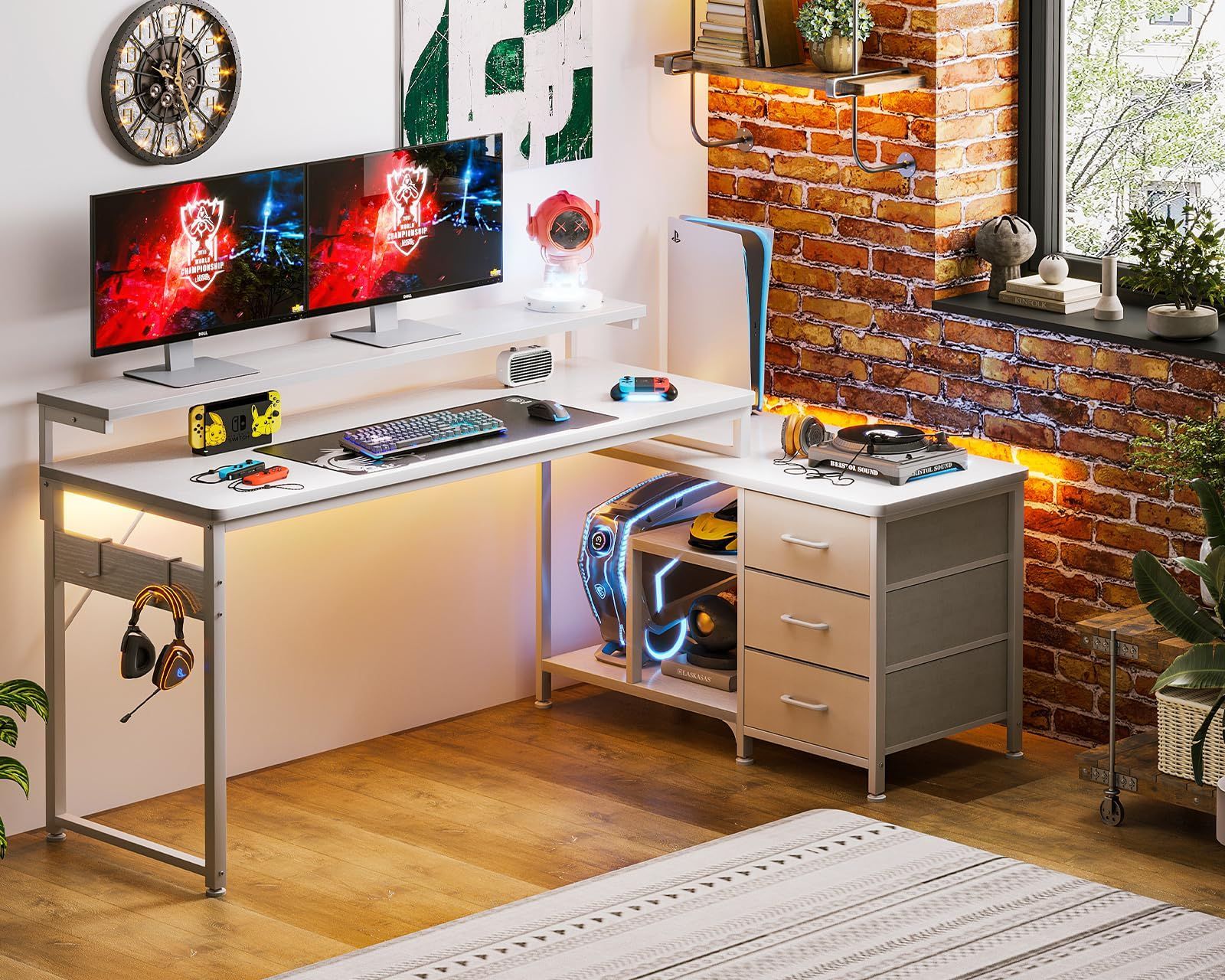 ODK パソコンデスク 引き出し付き ゲーミングデスク コンセント付き l字デスク デスク 机 幅173*100 pcデスク 棚付き desk 収納 オフィスデスク 仕事用 在宅勤務 組立簡単 ホワイト