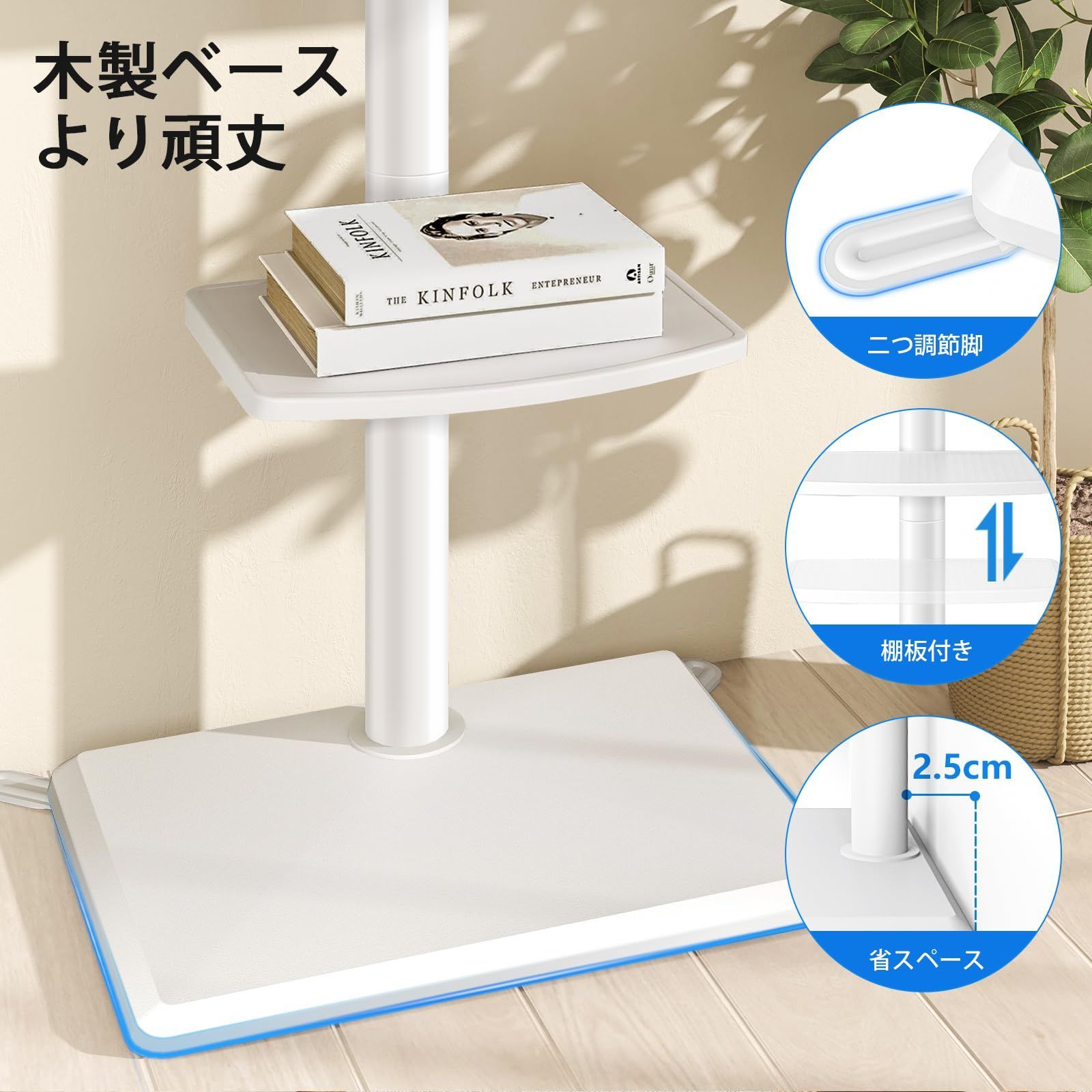 木製ベース、調節脚:壁寄せテレビスタンドの台座は木製で、ガラスより安全で地震時壊れることをご心配なく。直接壁に寄せて置いてあるいは調節足を開いて様々な場合で使用できます、ワイヤなども要らないで、とても安全です。