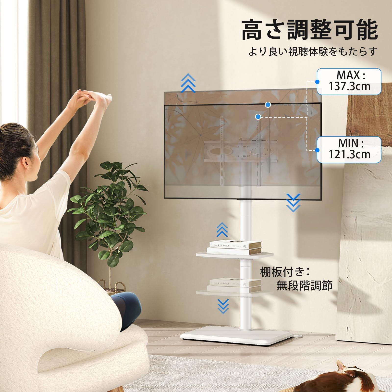 高さ調節、左右首振り:テレビ スタンドはブランケットが3段階で113.8から139.3 cmまで調整できます。左右角度35°変えられ、首振りが出来ます。リビングルームでもキッチンでも各部屋からテレビを快適に楽しめます。