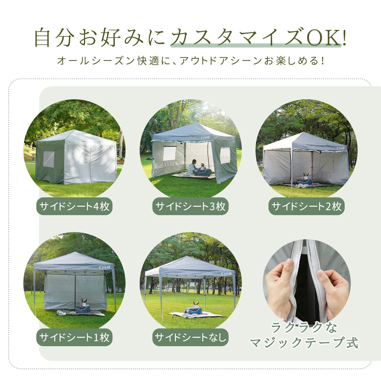 【オールシーズン対応】横幕4枚付き、シーンや季節に応じて様々な形態に変えることができます。バーベキュー、パーティー、アウトドアイベントなど、どの場面でも快適にご利用いただけます。