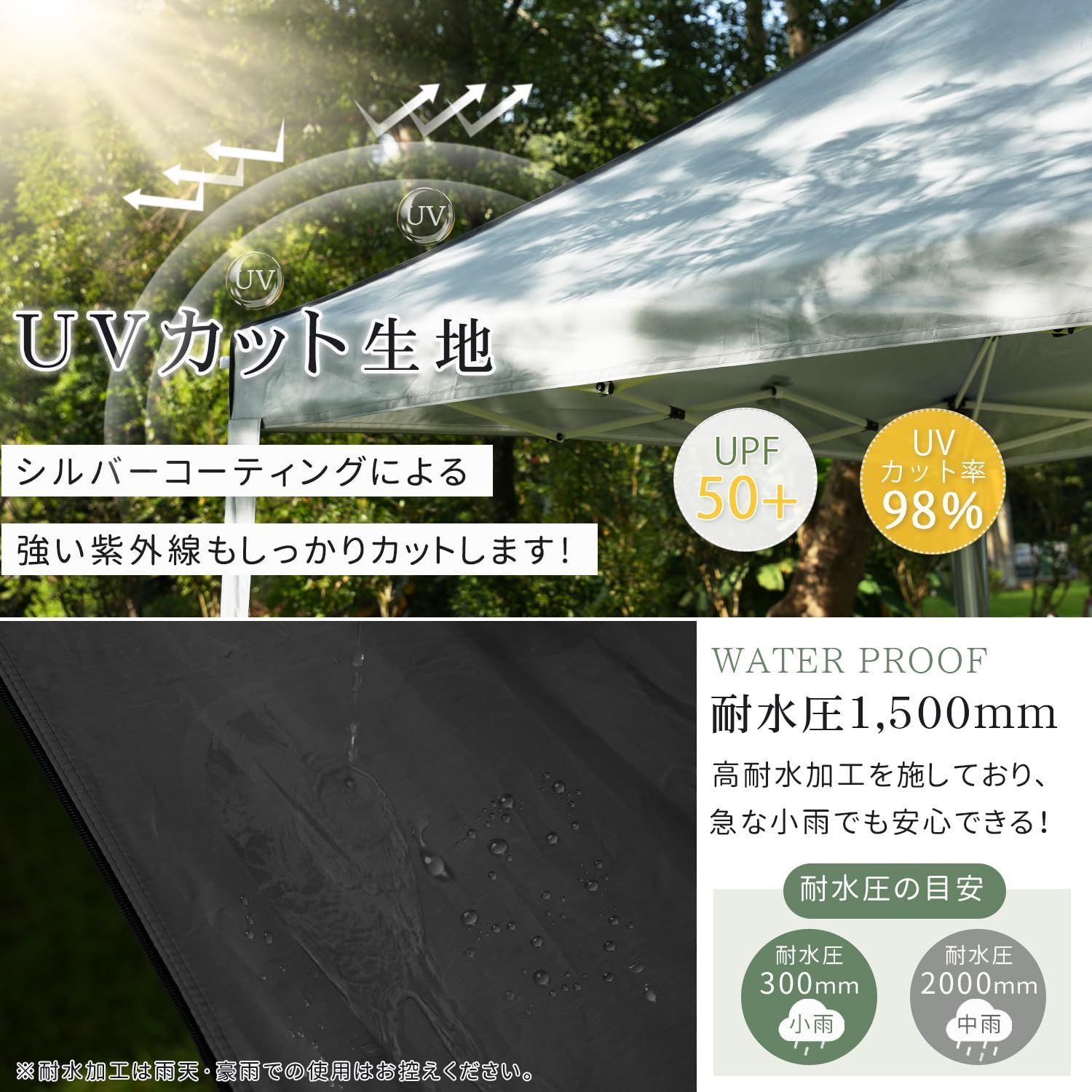【耐久性高い素材】①太く、厚みのあるステンレス製フレームで構造も安定し、防錆加工をしており、長くお使いいただけます。②高品質なUV加工&高耐水加工をした210Dオックスフォードを採用し、強い紫外線をしっかりガードできるし、突然の小雨でも心配いりません。(雨天での使用お控えください)