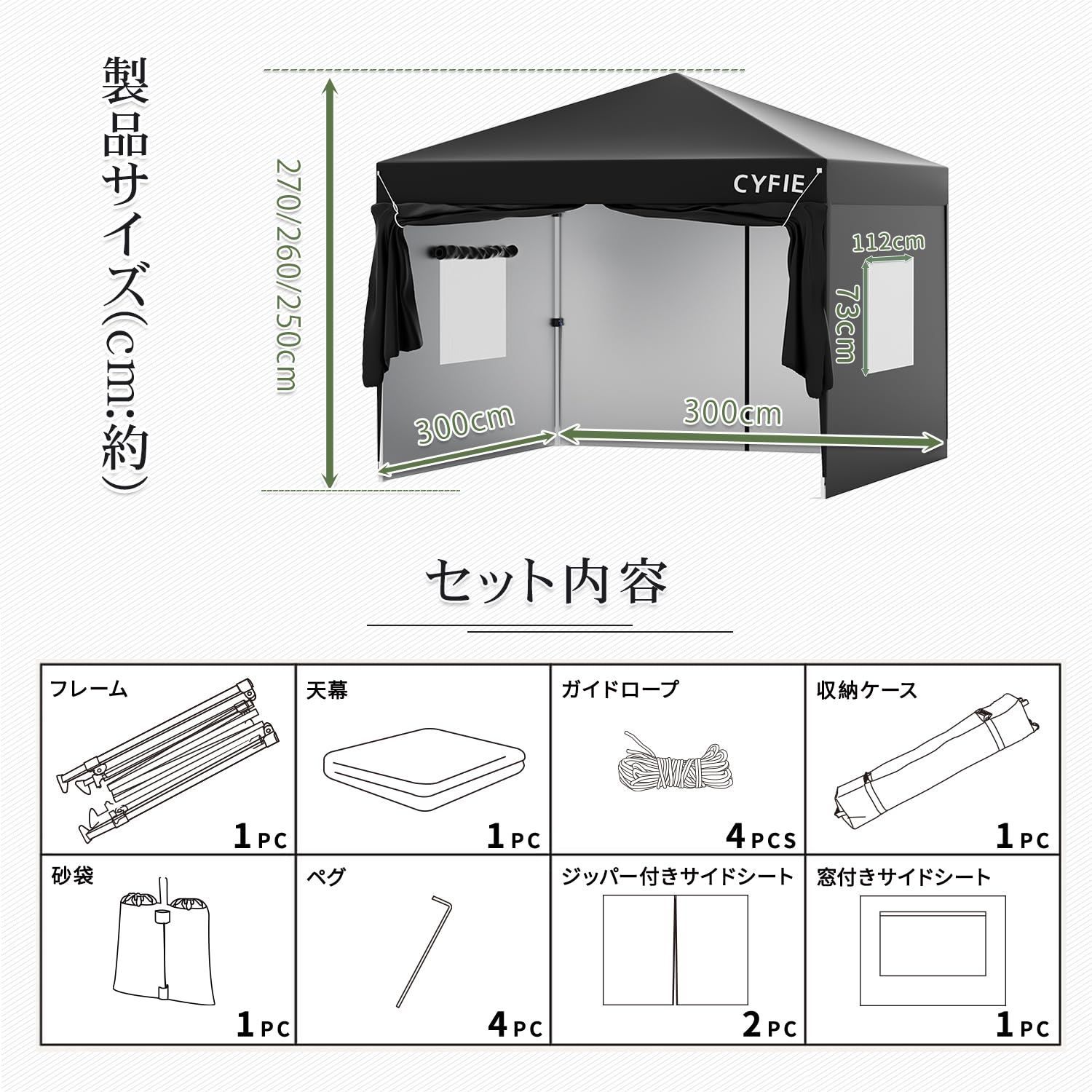 CYFIE タープテント 3m 横幕/サイドシート4つ付 ワンタッチタープ 網戸付き 3段階調節 UVカット 高耐水 遮光遮熱 ローラー付収納袋 アウトド/イベント/運動会/防災 300x300cm ブラック