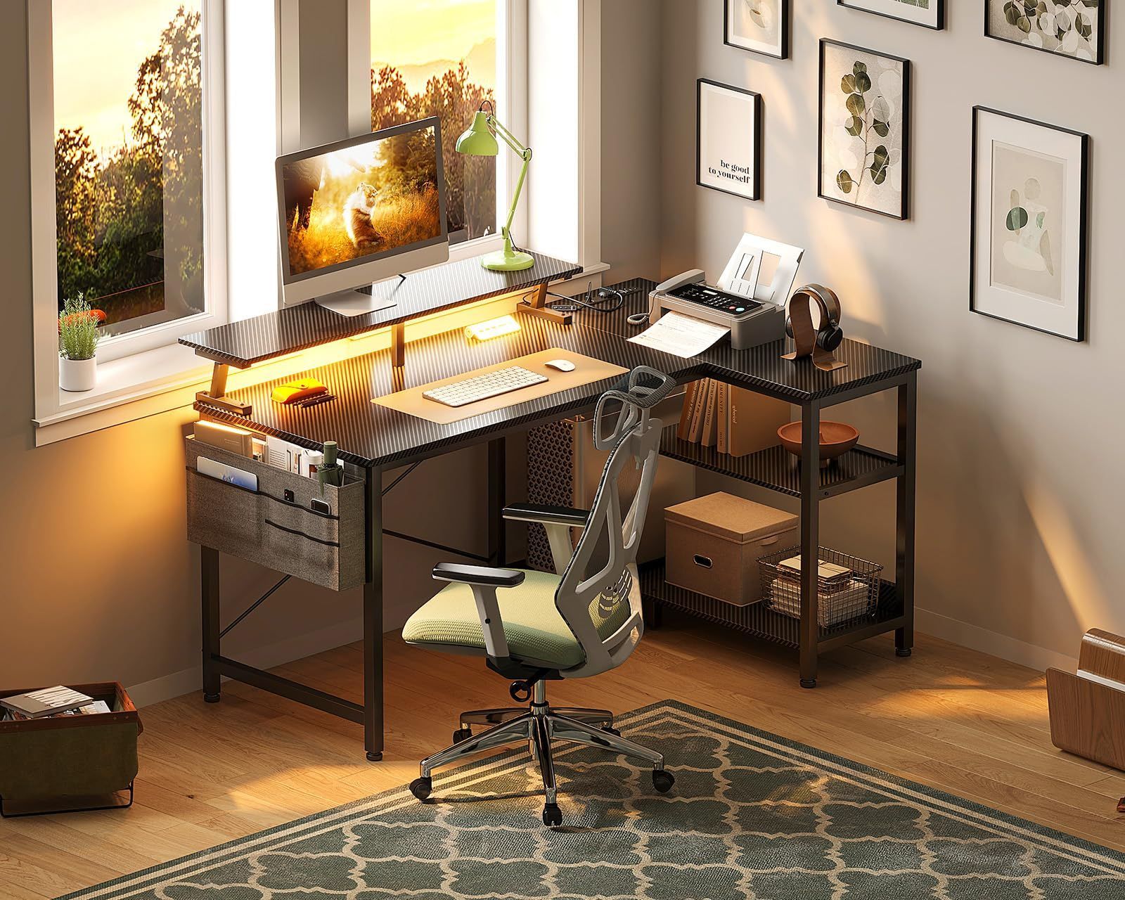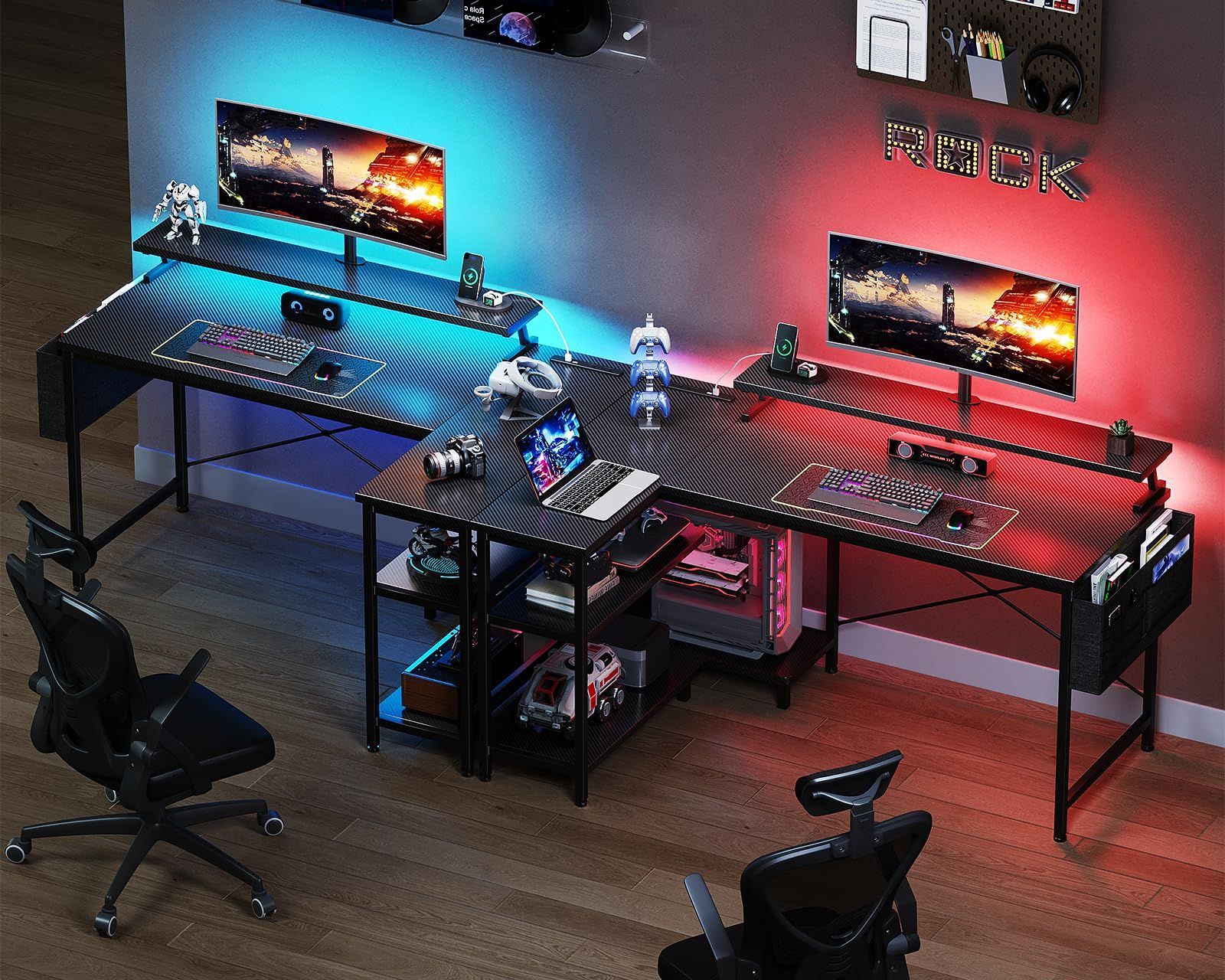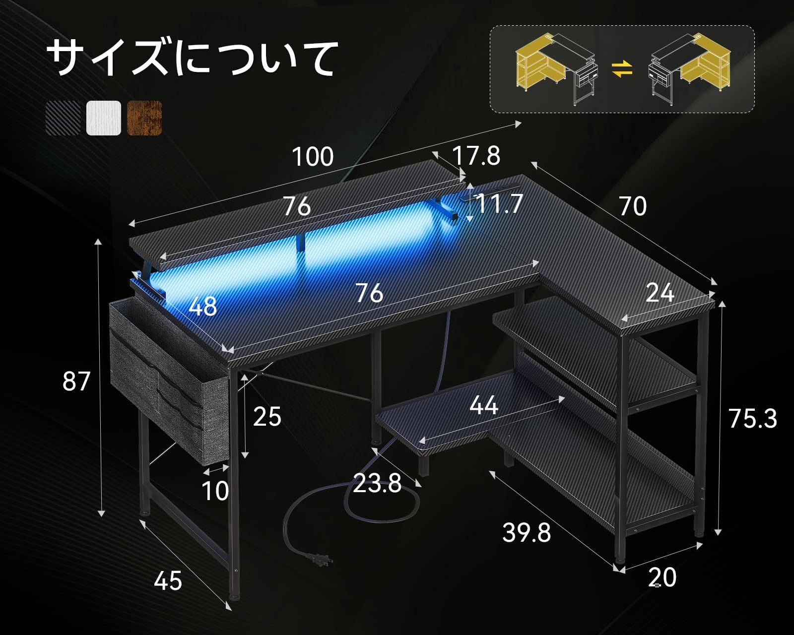 AODK ゲーミングデスク コンセント付き パソコンデスク RGBライト l字デスク 棚付き デスク 袋付き 机 幅100 pcデスク モニター台 desk 収納 オフィスデスク 在宅勤務 仕事用 組立簡単 カーボンブラック