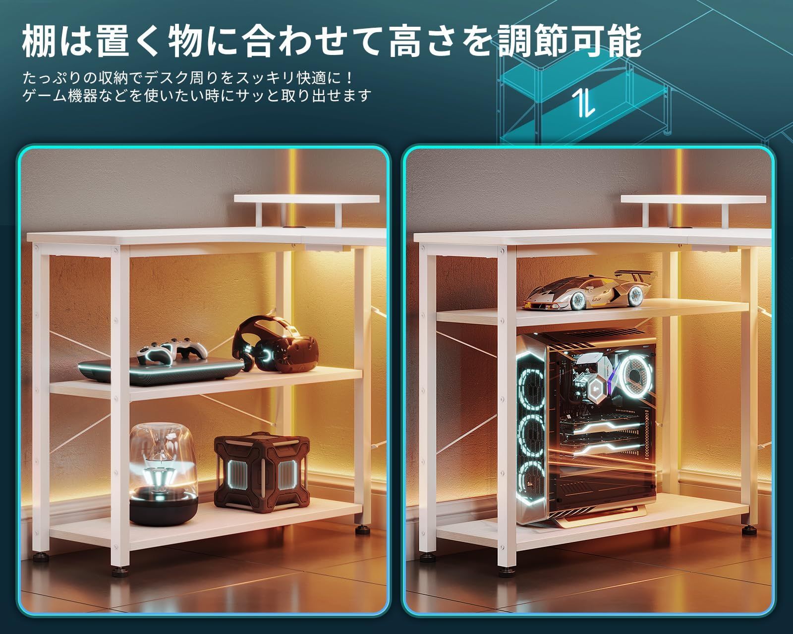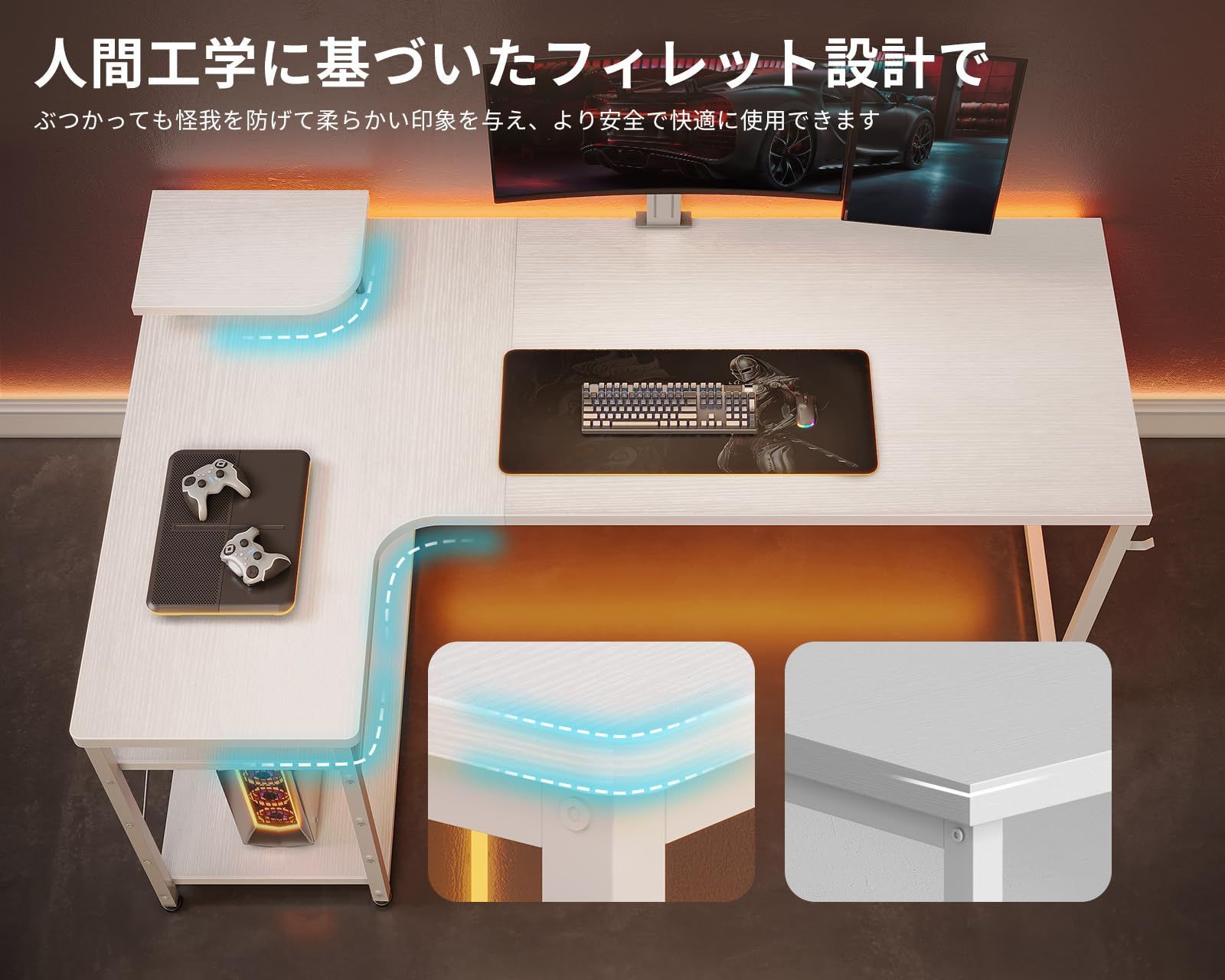 【ラック付きデスク】デスクの足元には一体型のラックが備え、本や書類などを使いたい時にサッと取り出せます。また、L字型のデザインで部屋のコーナーを最大限に活用でき、ご家庭でもオフィスでも、日常の操作に十分なスペースを確保できます。