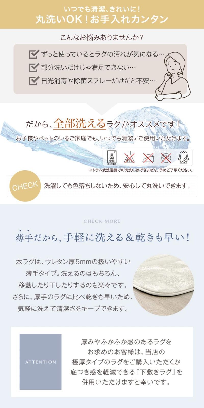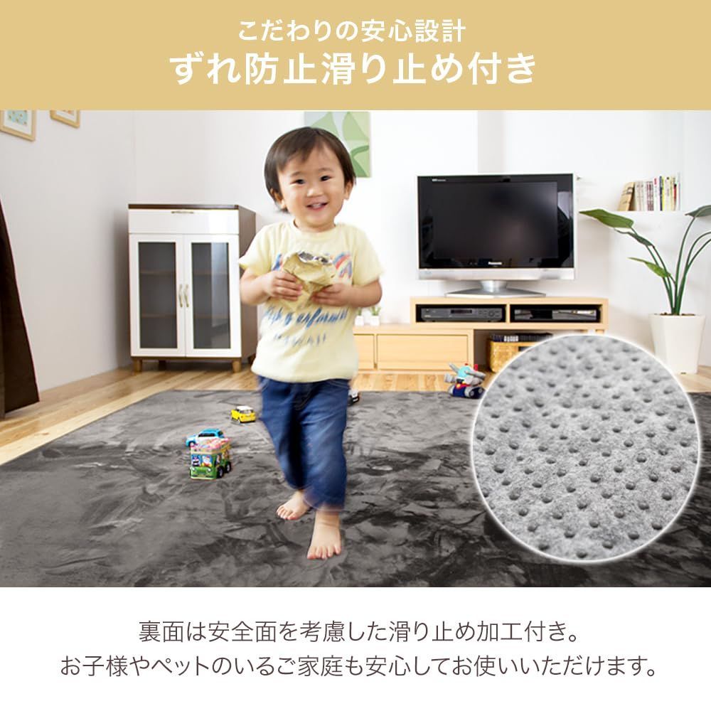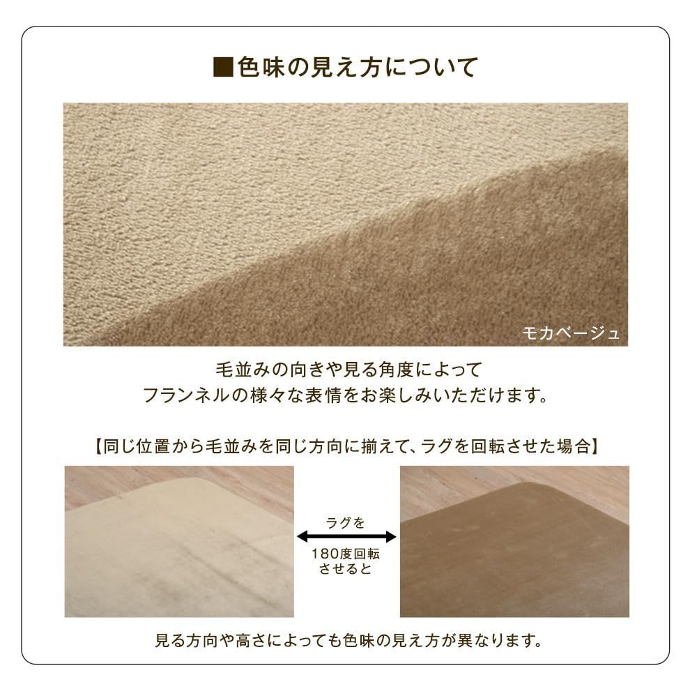 【備考】 ※素材(染料)の特性上、ご使用中や濡れた状態での摩擦により色移りする恐れがあります。ご使用の際、床材(塩化ビニル・フローリング等)の材質によっては、床がべたついたり、色移りする場合がありますので、以下の点にご注意ください。 ※長期間の同じ場所でのご使用はせずに、定期的に使用場所をずらしたり、床面を拭いてご使用ください。 ※特に、新築の床材やワックスがけ直後のご使用はご注意ください。 ※くつ下や履物を履いて歩くとすべりやすくなることがありますのでご注意下さい。 ※色落ちする場合がありますので他の物とは一緒に洗わないで下さい。 ※洗濯後は形を整えて直ちに干して下さい。 ※開梱直後はラグに折り目がついている場合がございます。 1週間程度で自然になくなりますので、そのまま 床に敷いてお使いください。 ※気温など環境によっては折り目がなくなるまでの時間に差が生じます。冬場の寒いところでは、時間がかかる場合がございますので予めご了承ください。 ※乾燥機のご使用はお避け下さい。