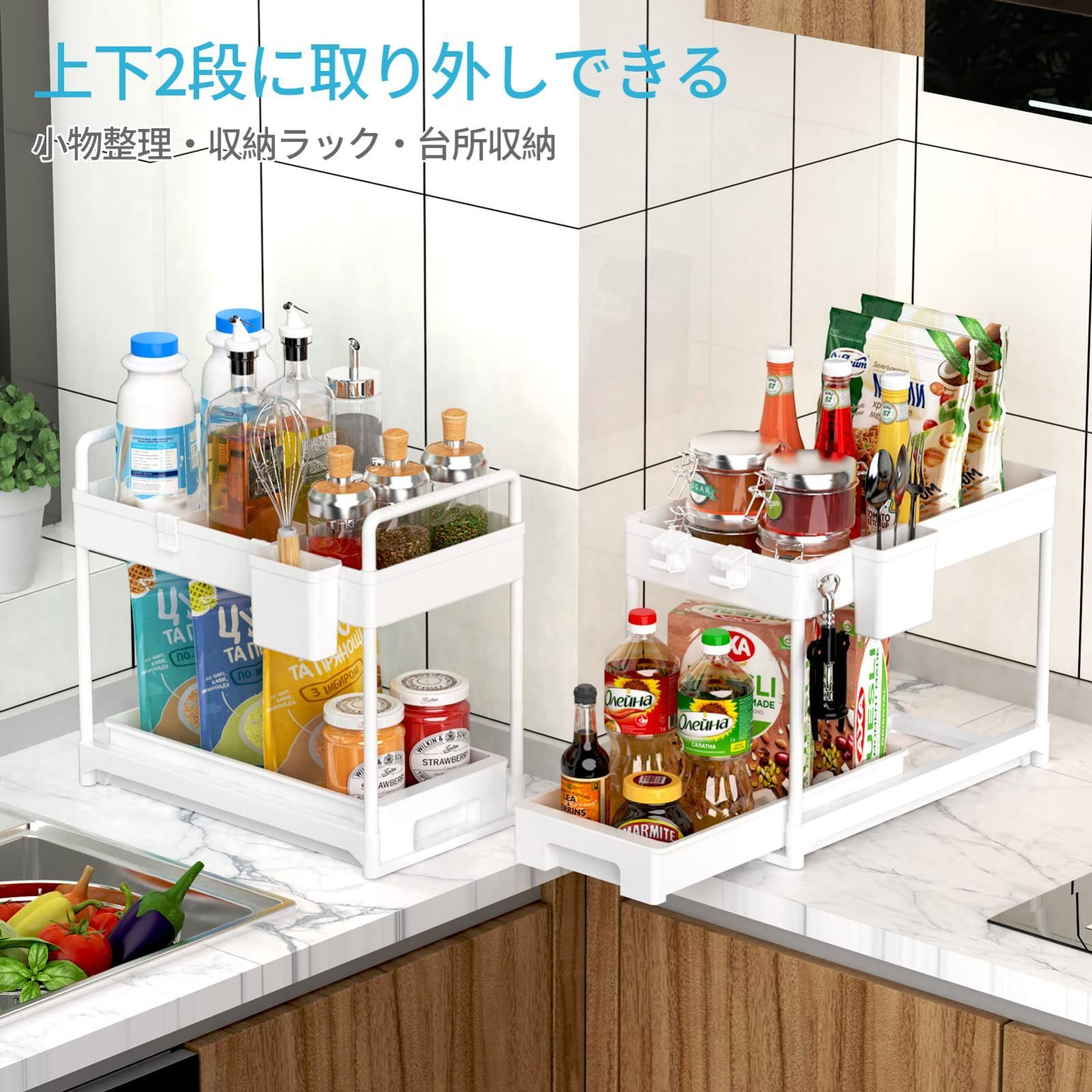 【引き出し式・スペース活用】引き出し式デザイン、滑りがよくてスムーズでノイズなし、スムーズに出し入れができるのでストレスフリーです。低い高いものをきちんと並んで、空間を効率よく利用できます。キッチン、コンロ横、洗面所、美容室などの隙間に適用。洗面台と壁の間、冷蔵庫横、玄関などでの使用に最適です。