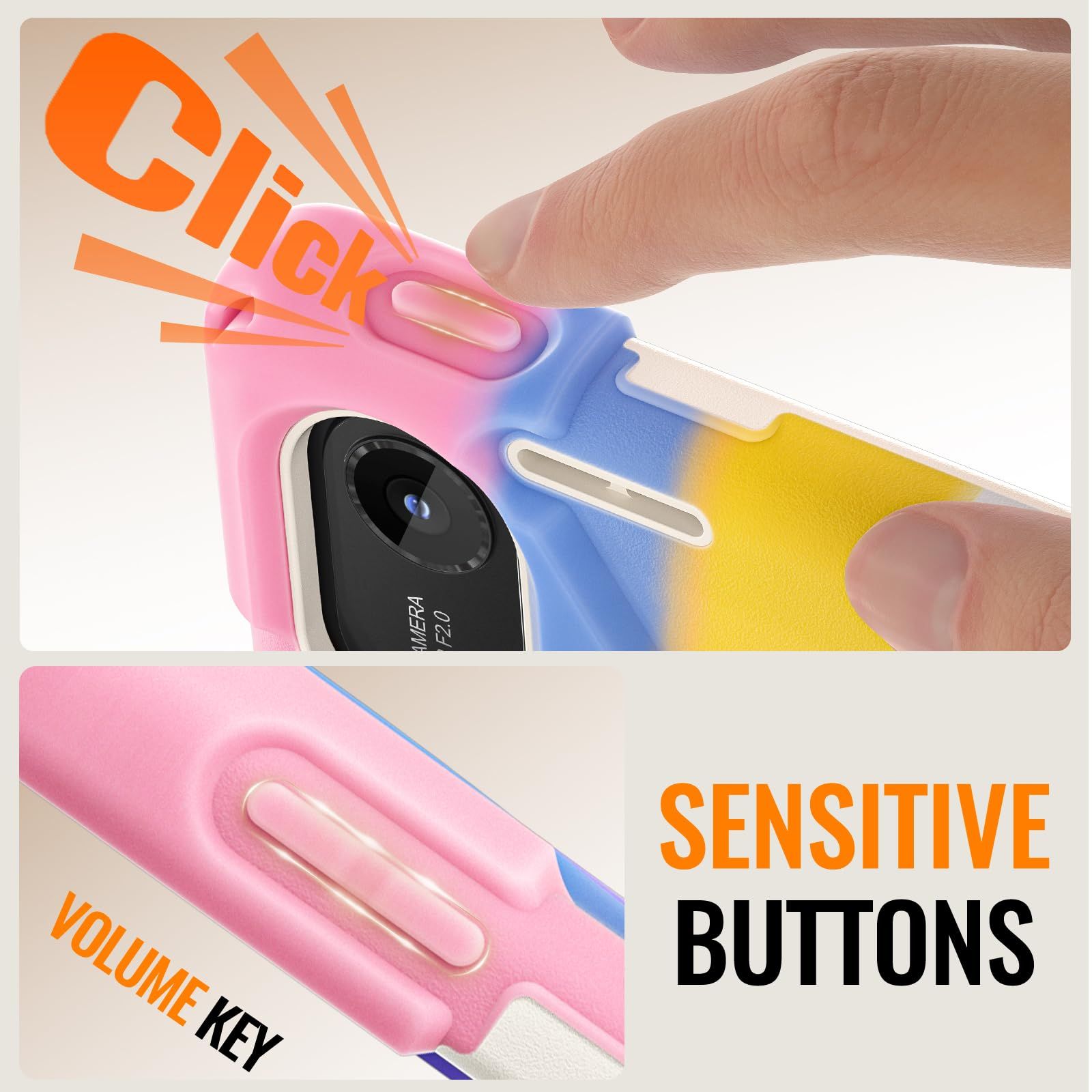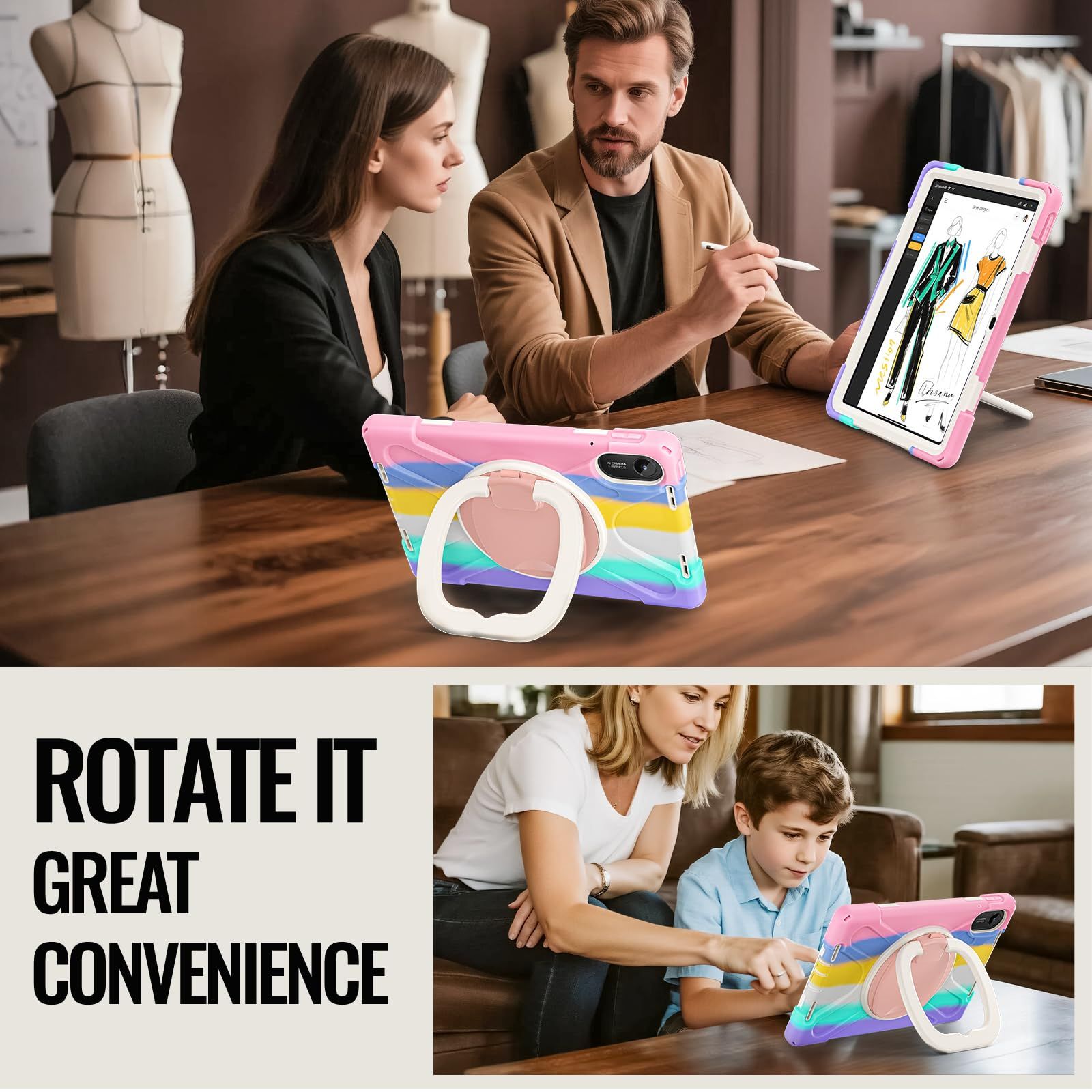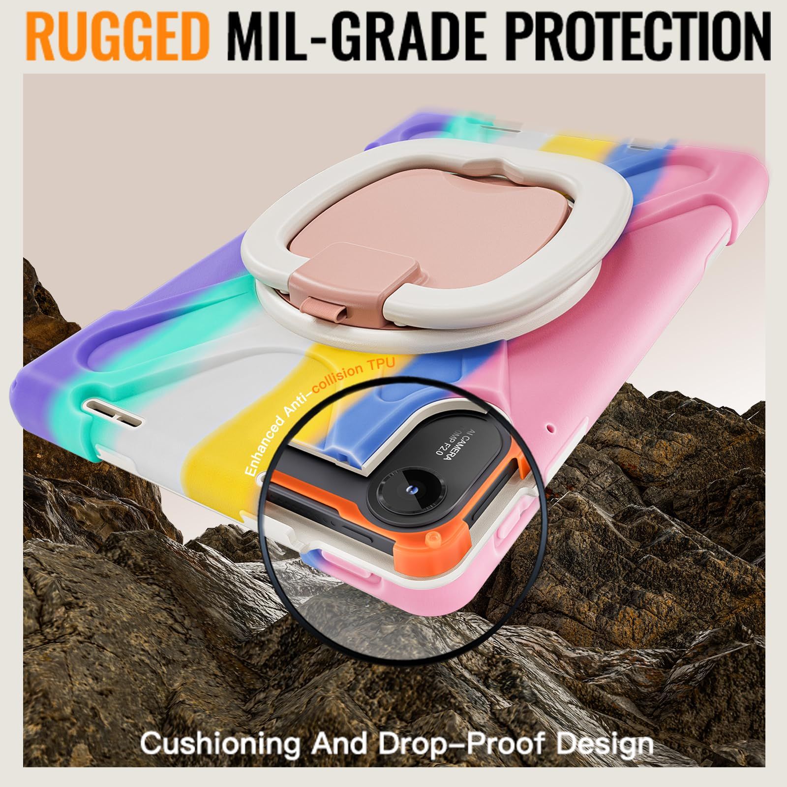 スタンド機能:動画鑑賞やタイピングなどシーンに合わせて角度を変えられる360度回転、段階調整可能スタンド。レインボーデザインで、カジュアルながらオシャレにきまる。