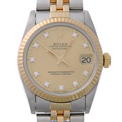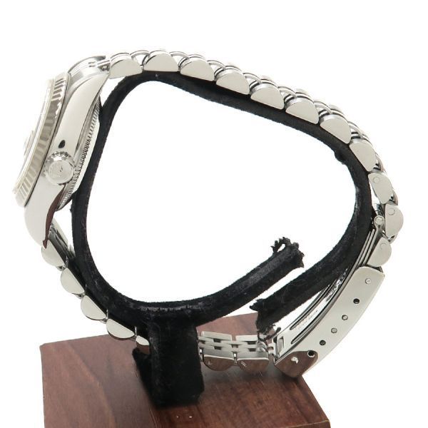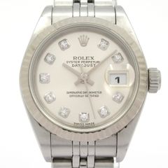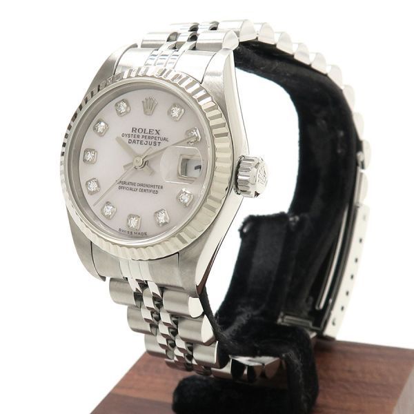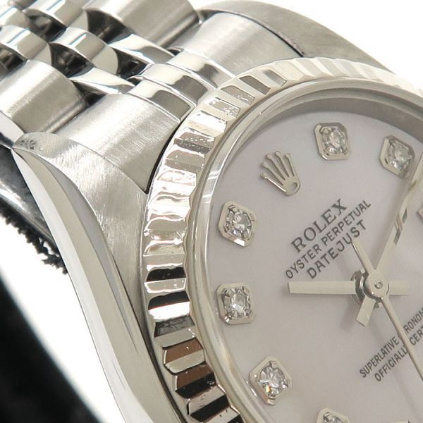 ROLEX(ロレックス)デイトジャストRef.79174NGF番2003年頃製ロレックスレディース・デイトジャストが入荷しました。ベゼルのみホワイトゴールド製となります。ホワイトシェルダイアルに10Pダイヤの組み合わせとなり、オンオフ問わずお使いいただけます。当社提携の時計修理工房にて外装の仕上げとオーバーホールを行っております。ベゼルには全体的に傷があり、裏蓋に微かなスレ、ブレスレットに伸びがございます。また、ガラスの12時付近に極僅かな欠けがございます。ロレックスの定番モデルデイトジャストをお見逃し無く。整備仕上げ・オーバーホールブレス内径約16cm