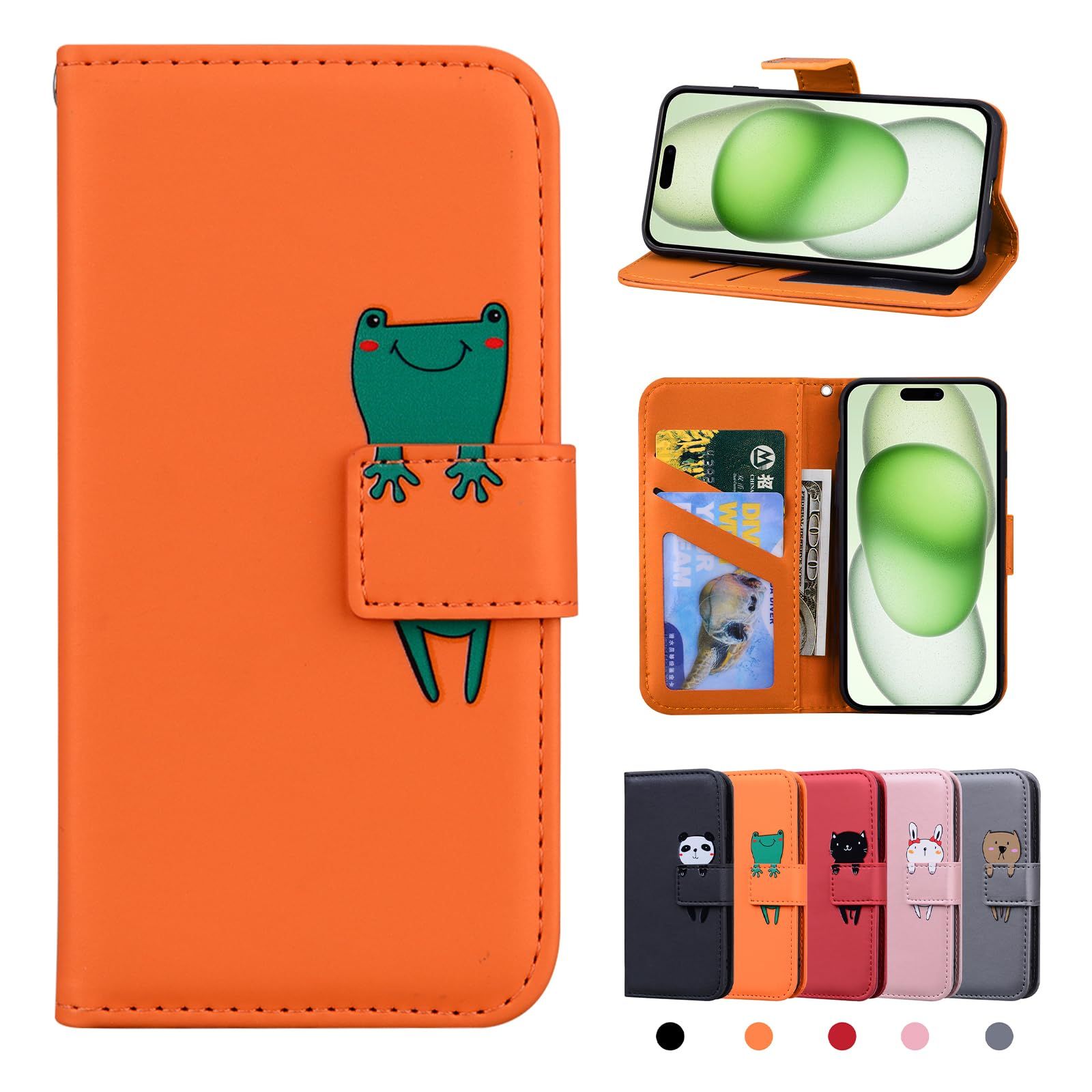 CASAFUNY 対応 iPhone 15 plus ケース 手帳型お洒落 用の アイフォン15プラス ケース 手帳型 手作り 高級 PUレザー 全面保護 かわいい 動物柄 携帯カバー 用の iphone15plus スマホケース アイフォン15 プラス カバー 横置きスタンド機能 内蔵マグネット 耐衝撃 軽量(6.7インチ)オレンジ色のカエル