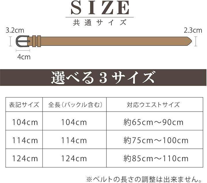 「サイズ」全長(バックル含む):104cm/114cm/124cm 幅2.3cm(23mm) バックル部最大幅3.2cm(32mm)
