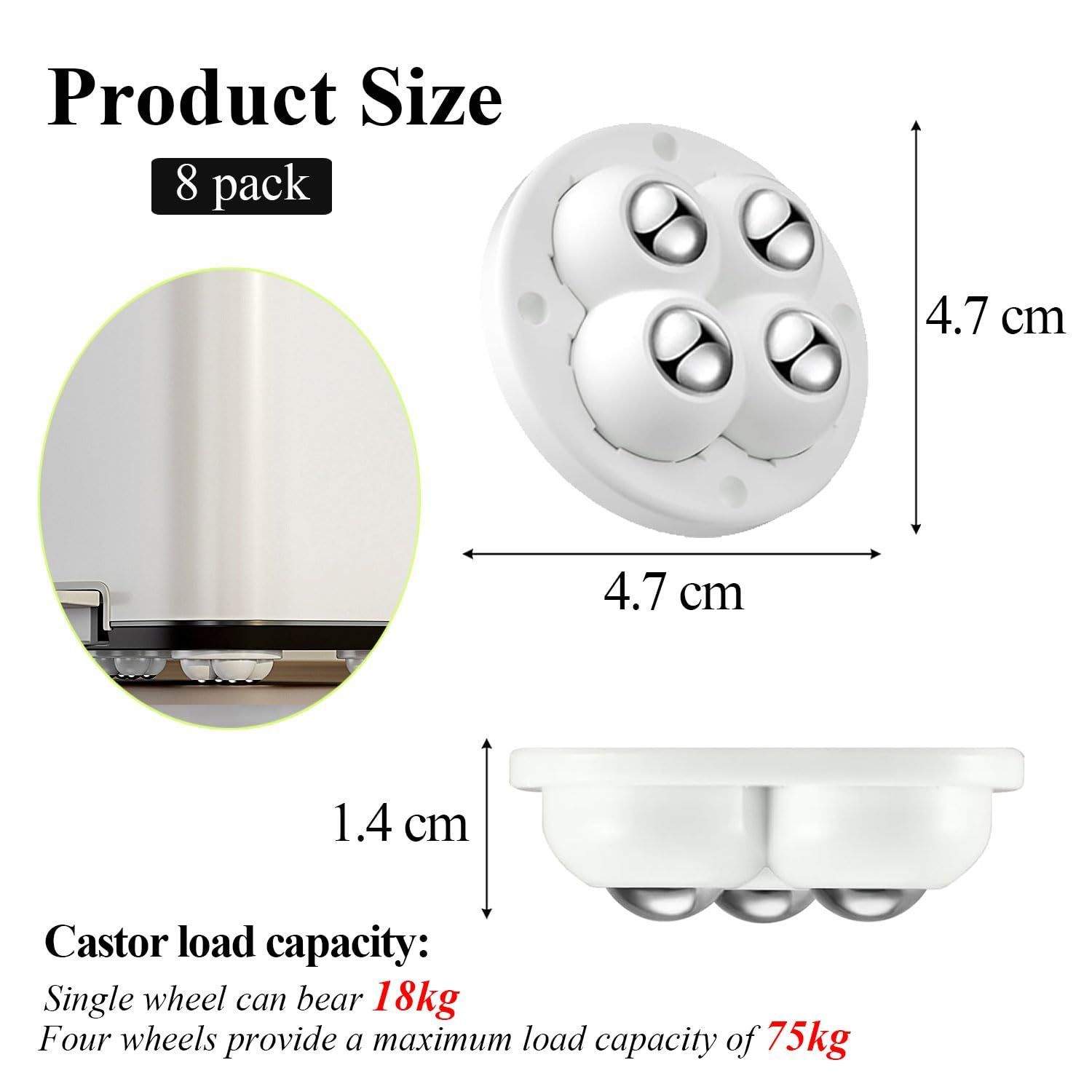 お得なパッケージリスト --- 小型粘着式キャスターホイール8個とステンレス製ベアリングローラーボール4個をお届けします。1輪あたりの耐荷重は18kg。4輪合計で最大75kgまで支えることができます。