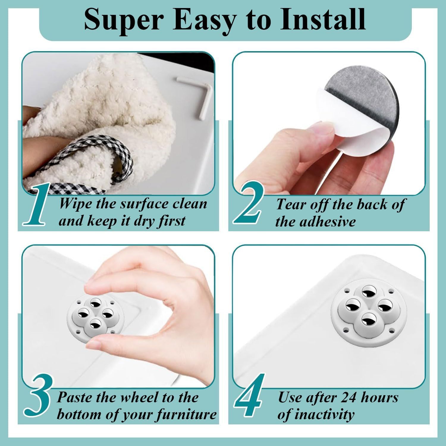 幅広い用途 これらの多用途回転キャスターは、収納ボックス、ゴミ箱、キッチンキャビネット、おもちゃ箱、植木鉢、カート、コーヒーメーカー、トースター、ベッドサイドテーブル、小型家庭用家具など、幅広いアイテムに使用できます。また、DIYプロジェクト、子供のおもちゃ、工作にも最適です。