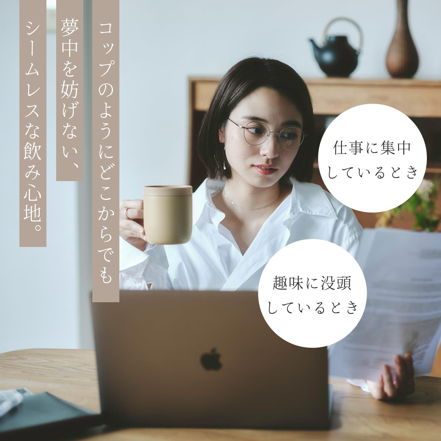 【360°どこからでも飲める】コップのようにどこからでも。フタを開閉する必要がなく、 360°どこからでも飲めます。真空二層構造で飲みものの温度をキープ。 何かをしながらでも、飲みものをおいしく愉しめます。