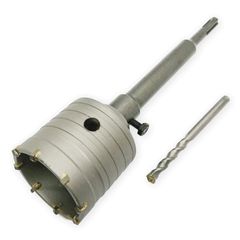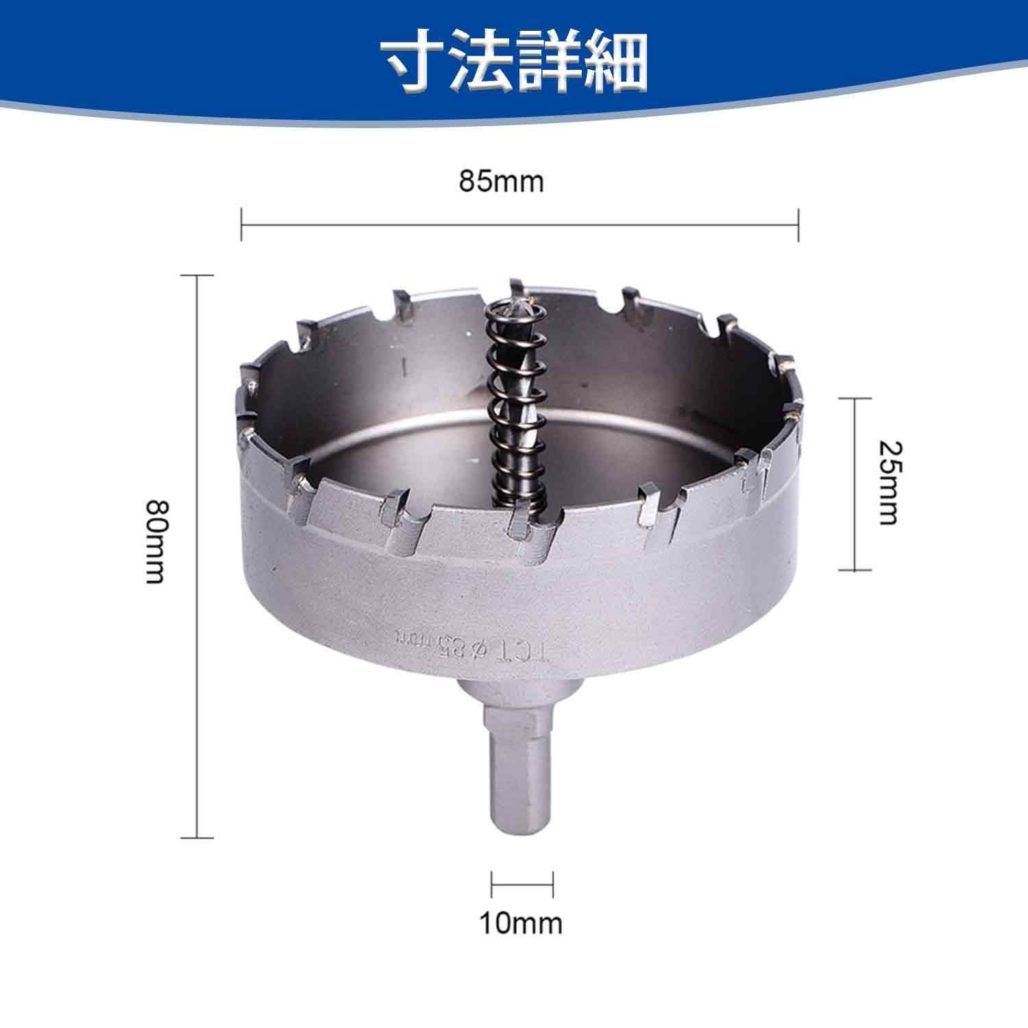 【仕様詳細】ホールソーの全長80mm、切削直径:85mm、軸径10mm、切り込み深さ:25mm。対応機種-電気ドリル 、充電式ドリルドライバー 、超硬チップ使用 、電動ドリル・ボール盤対応。精度が必要な場合は、ボール盤やドリルスタンドを利用してください。 パッケージの内容:ホールソーとセンタードリル・六角レンチ付き(センタードリルはシンニング加工によりポンチングが不要です。)
