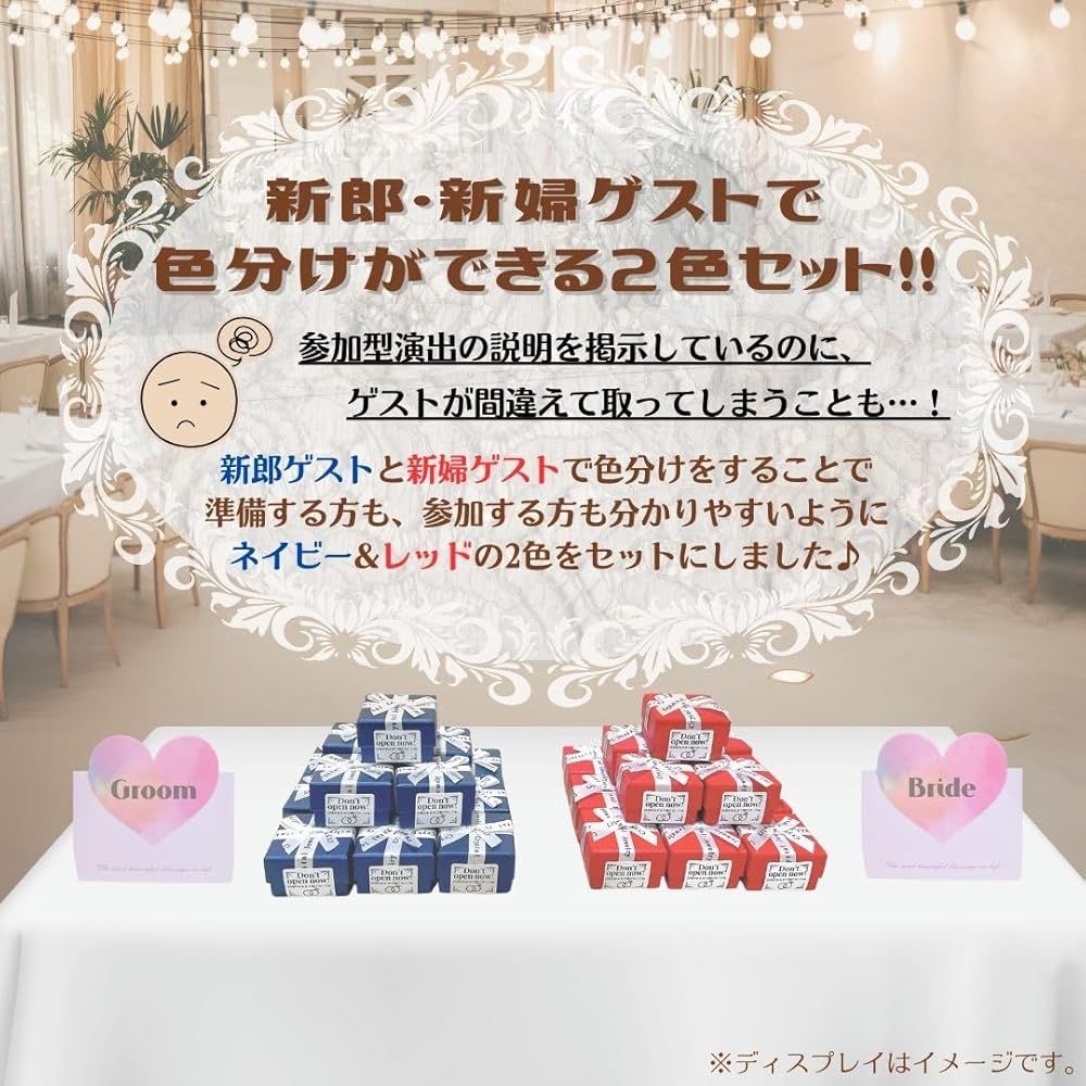 【赤と紺の2色セット】新郎新婦で色分けができる2色セットのリングケースで、準備する際や配る際にわかりやすく、見た目も華やかでリボンが映える赤と紺のBOXです。