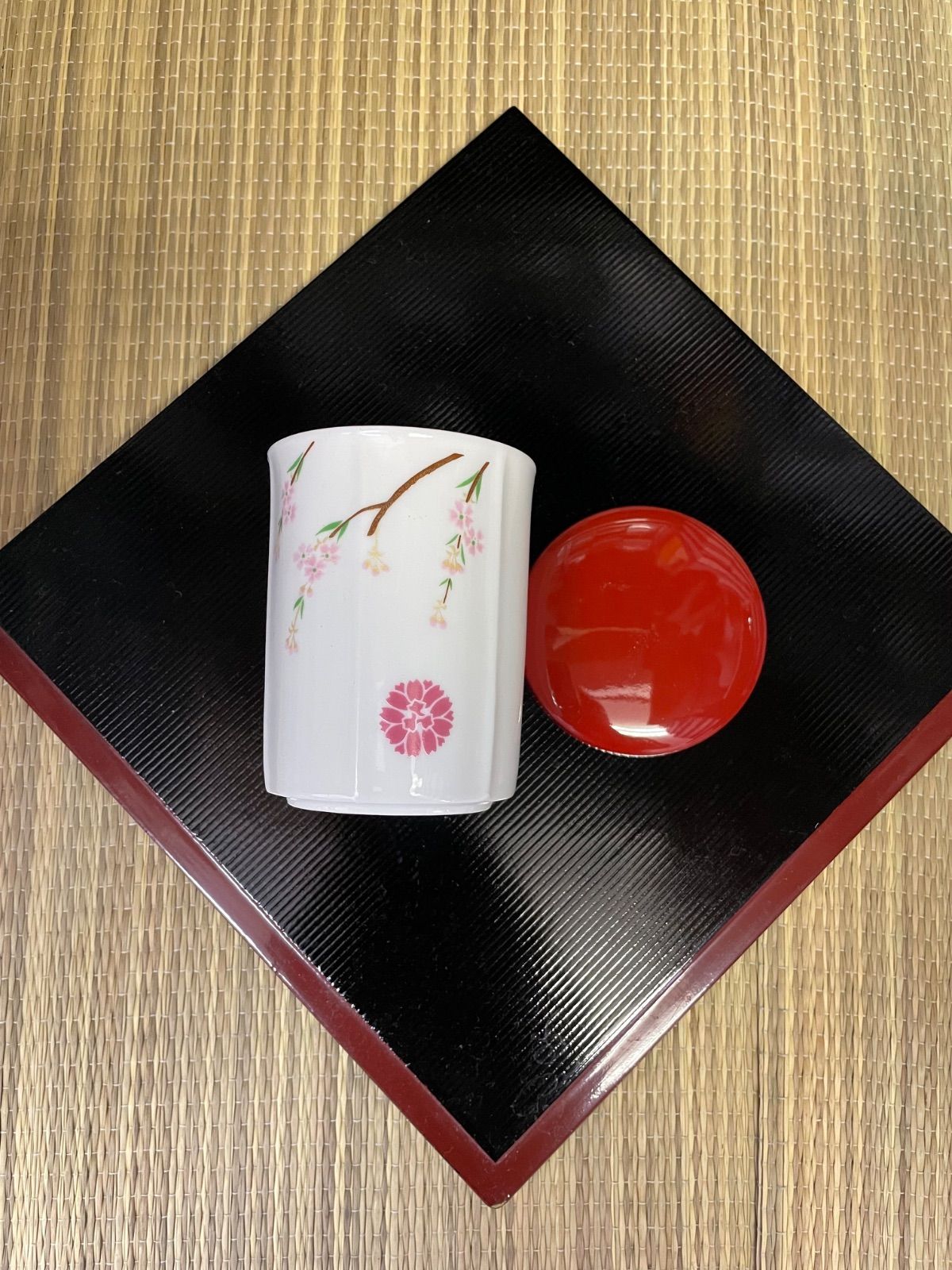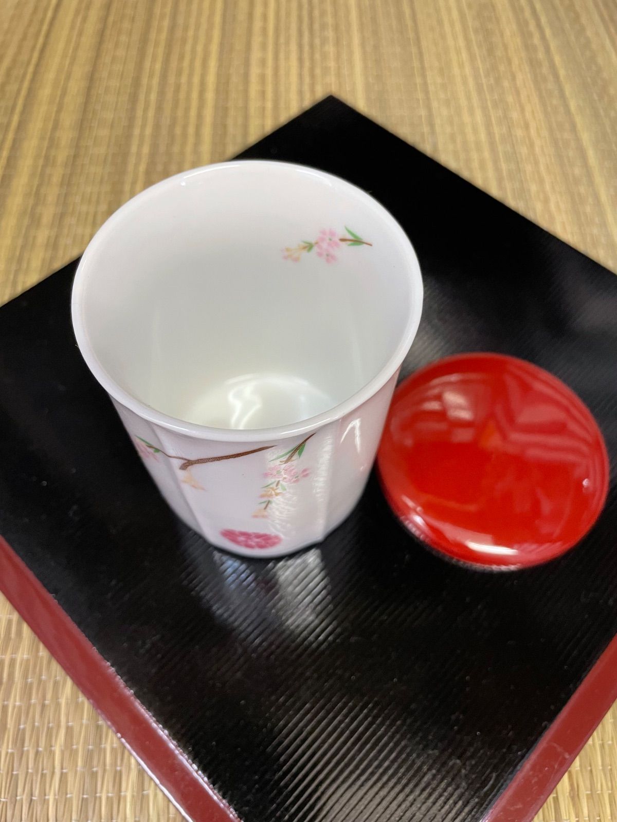 贈答品 たち吉湯呑み 湯呑み桜柄と三ツ桜紋 蓋付き・箱入り 税込み