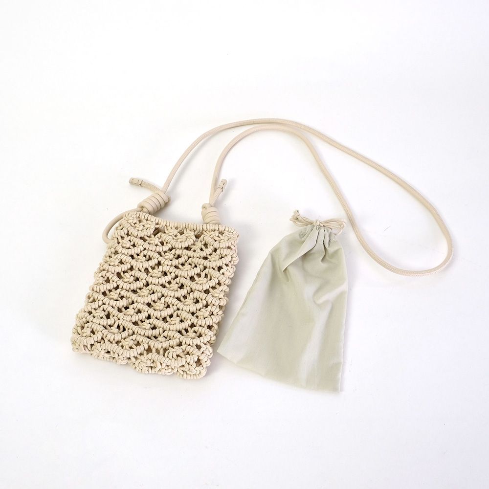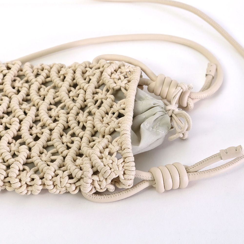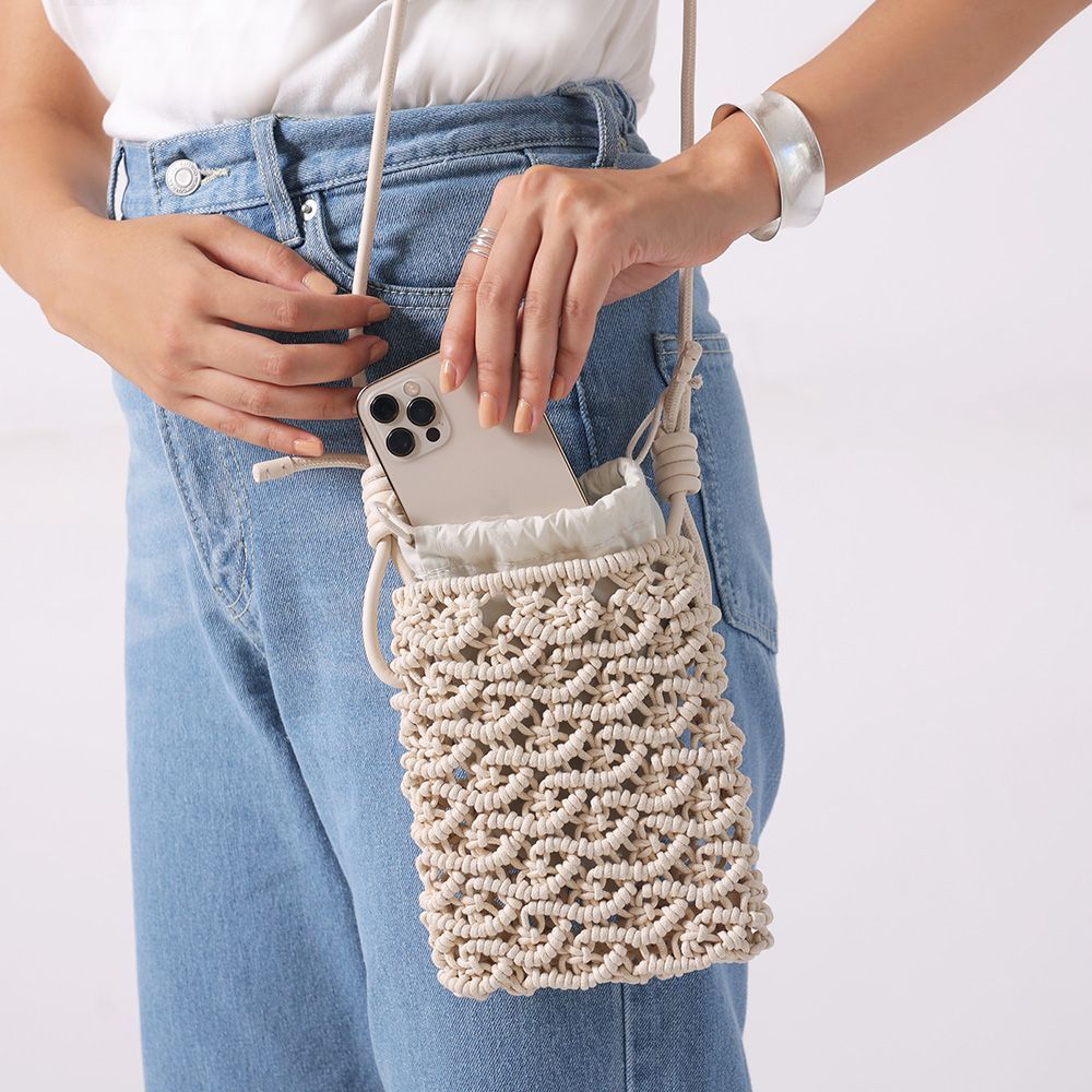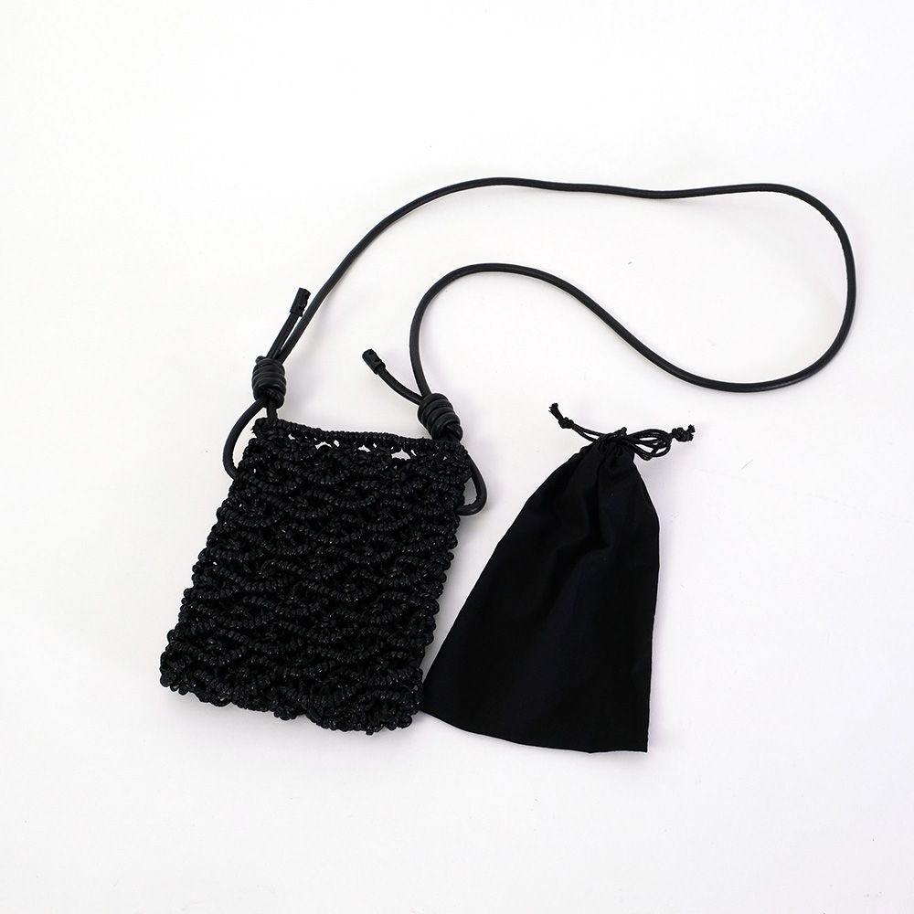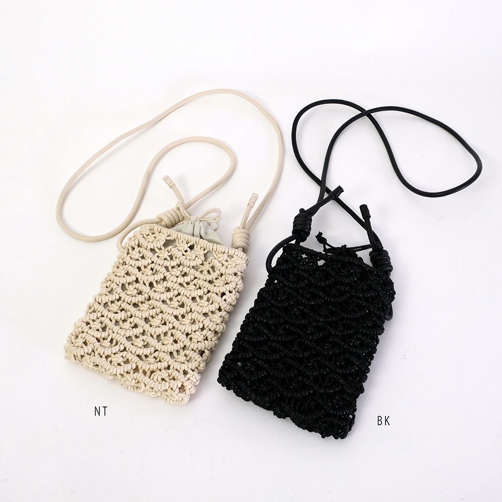 密な編み地とフェイクレザーの巻きコードが高見えするミニショルダー。スマホが丁度入る大きさでタウンユース使いにぴったりです。