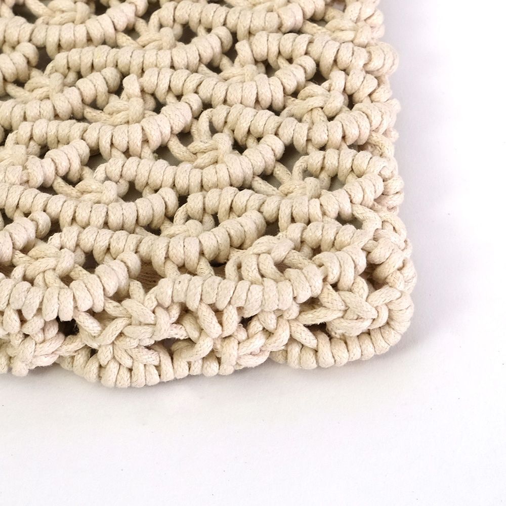 マクラメ編みは編み棒などを使わず、紐や糸を手で編み、結び目を作ることで模様を生み出していく技法です。その 語源はアラビア語のムクラムといわれ、交差して結ぶという意味があります。古くから 世界中で親しまれてきたマクラメ編みは、たくさんの結び方や編み方があり、ハンドメイドならではの素朴な風合と美しい編み目模様が魅力です。