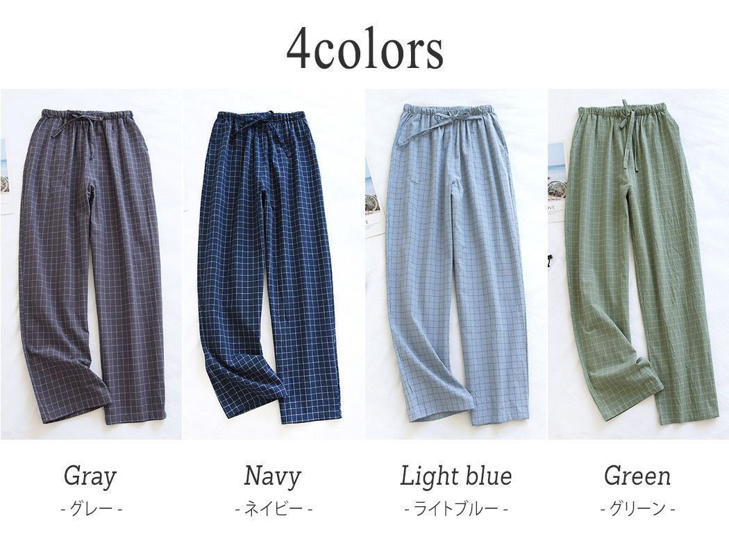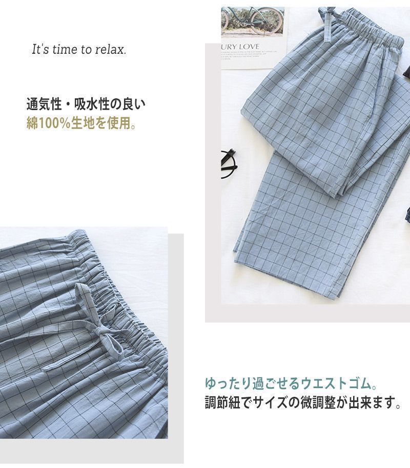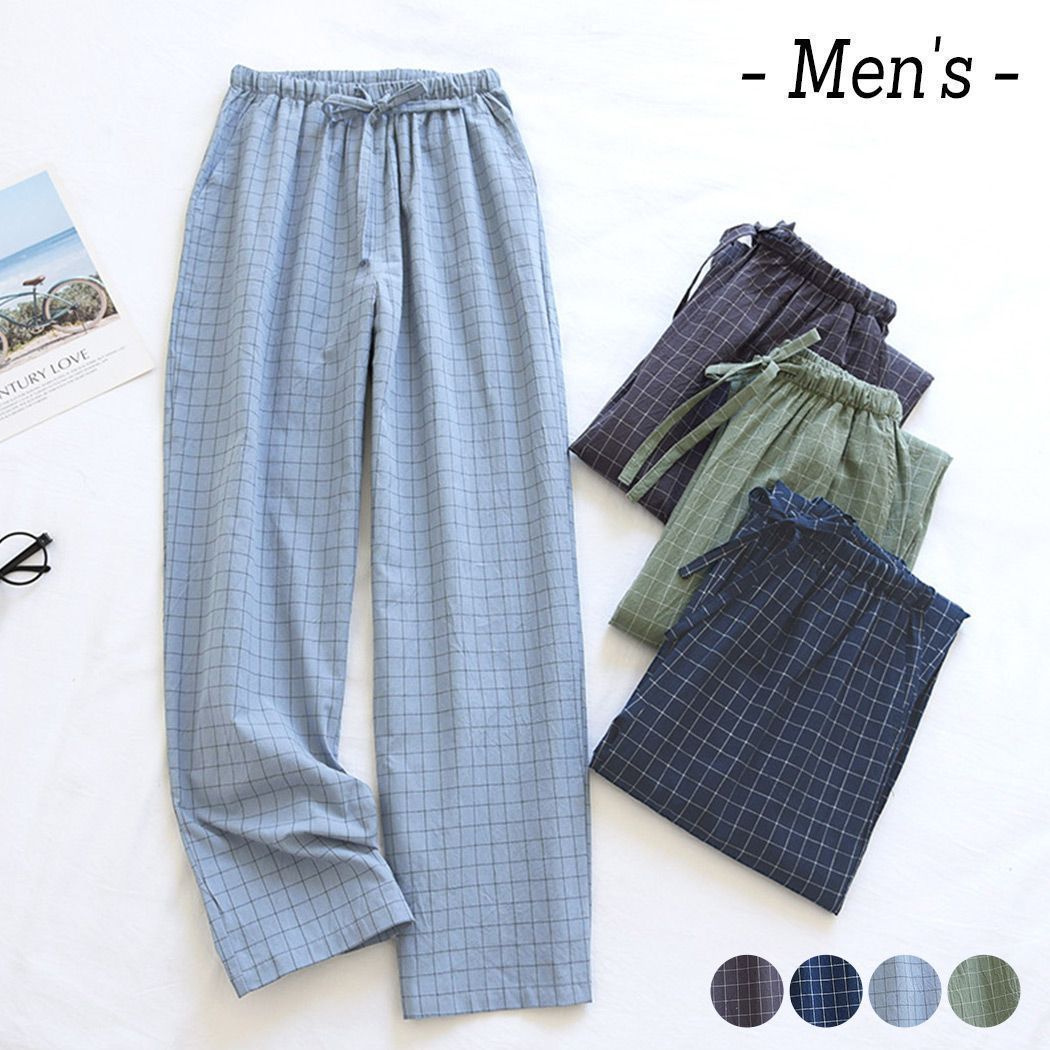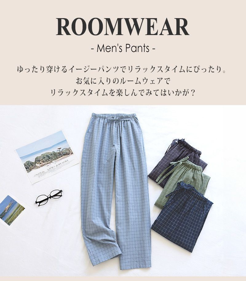 ルームウェア メンズ パンツ 春 夏 長ズボン 薄手 ボトムス ロング丈 ゆったり チェック柄 ウエストゴム ストレート パジャマ 部屋着 寝巻き ワンマイルウェア ポケット ひも ウエスト調節 リラックス おうち時間 旅行 入院 着替え プレゼント 父の日 ギフト リラックス