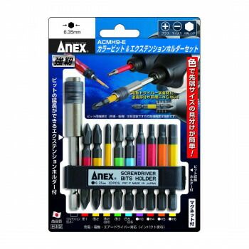 ビットに塗装された色で先端サイズの見分けが簡単。ネジ・ビス締めに。ビットの延長ができるエクステンションホルダー付き。ビットはプラス、マイナス、六角レンチの3種のネジ溝に対応。両端部分は非塗装で精度抜群。マグネット付。刃先に磁力が帯びているので便利です。