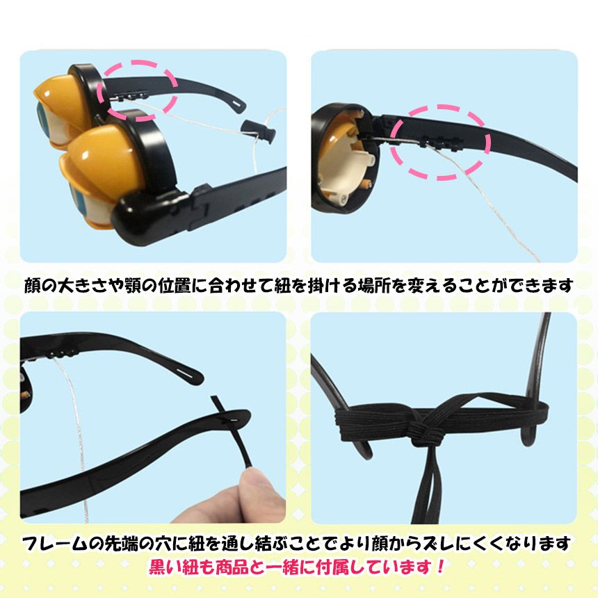 付属のゴム紐をフレームの先端に通し結べば、頭からメガネがズレにくくより操作がしやすくなります!